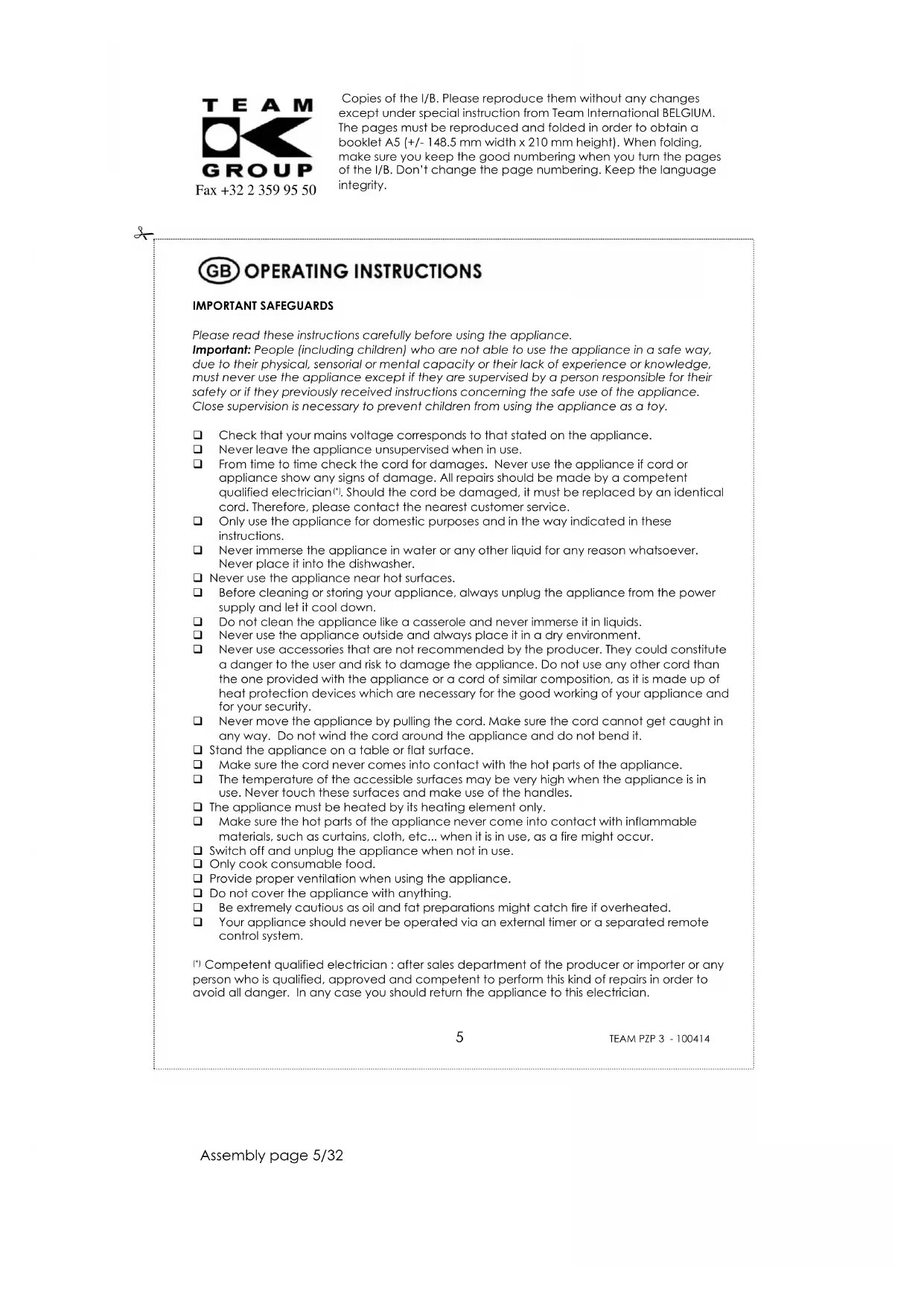 Competent qualified electrician : after sales department of the producer or importer or any person who is qualified, approved and competent to perform this kind of repairs in order to avoid all danger. In any case you should return the appliance to this electrician.Copies of the I/B. Please reproduce them without any changes except under special instruction from Team International BELGIUM. The pages must be reproduced and folded in order to obtain a booklet A5 (+/- 148.5 mm width x 210 mm height). When folding, make sure you keep the good numbering when you turn the pages of the I/B. Don’t change the page numbering. Keep the language integrity.