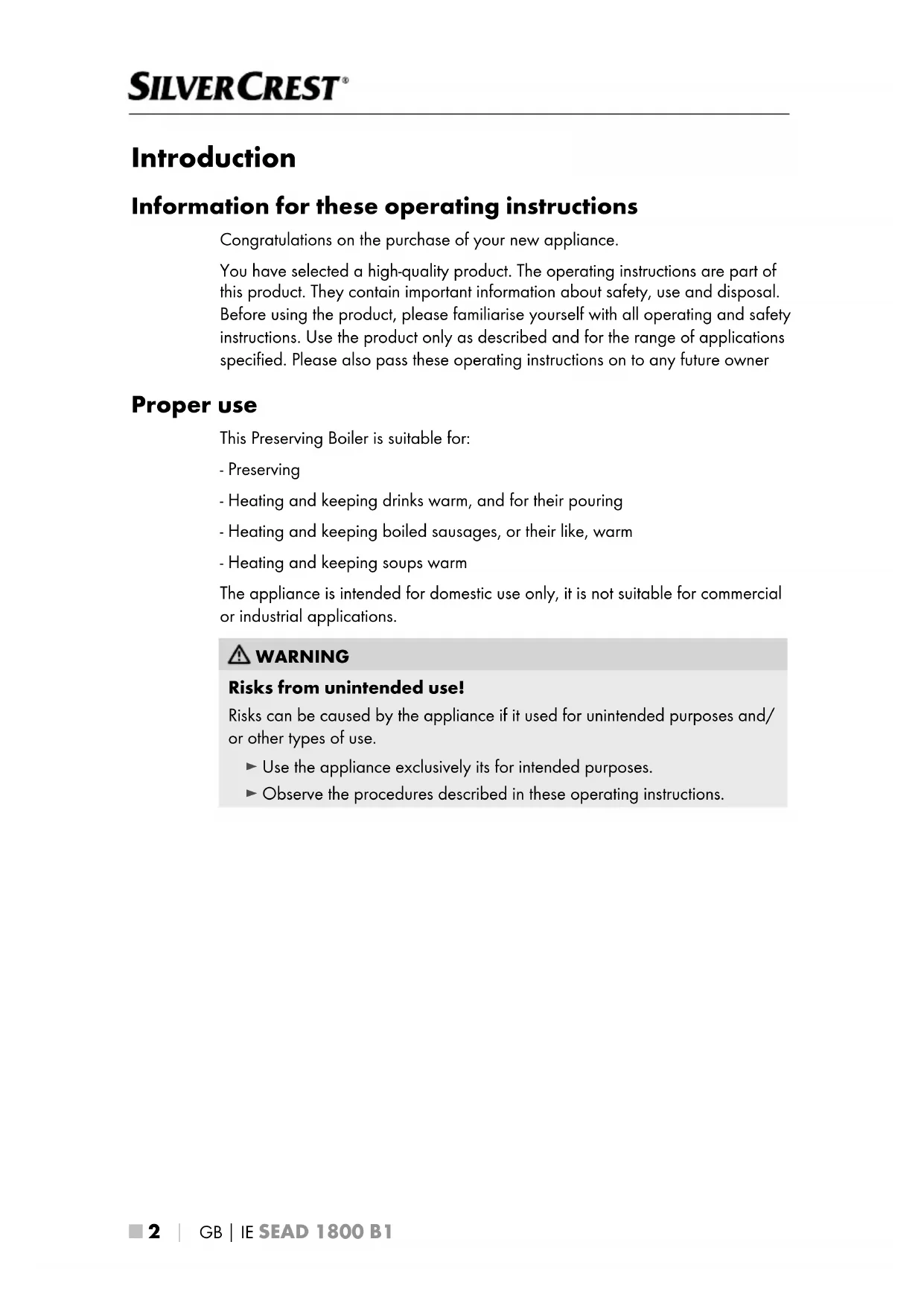 Introduction Information for these operating instructions Congratulations on the purchase of your new appliance. You have selected a high-quality product. The operating instructions are part of this product. They contain important information about safety, use and disposal. Before using the product, please familiarise yourself with all operating and safety instructions. Use the product only as described and for the range of applications specified. Please also pass these operating instructions on to any future owner Proper use This Preserving Boiler is suitable for: - Preserving - Heating and keeping drinks warm, and for their pouring - Heating and keeping boiled sausages, or their like, warm - Heating and keeping soups warm The appliance is intended for domestic use only, it is not suitable for commercial or industrial applications. WARNING Risks from unintended use! Risks can be caused by the appliance if it used for unintended purposes and/ or other types of use. ► Use the appliance exclusively its for intended purposes. ► Observe the procedures described in these operating instructions. IB_444431_SEAD1800B1_LB8.indb 2 23.10.2023 13:23:16GB