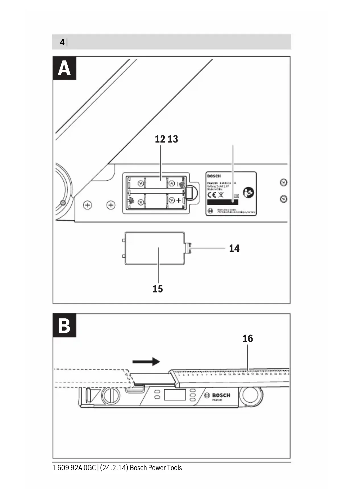 Calculated angle accuracy ±0.1° The measuring tool can be clearly identified with the serial number 13 on the type plate. OBJ_BUCH-2116-002.book Page 23 Monday, February 24, 2014 10:56 AM24 | English 1 609 92A 0GC | (24.2.14) Bosch Power Tools Assembly Inserting/Replacing the Batteries (see figure A) Using alkali-manganese or rechargeable batteries is recommended for op- eration of the measuring tool. To open the battery lid 15, press the latch 14 and remove the battery lid. Insert the batteries/rechargeable batteries. When inserting, pay attention to the correct polarity according to the representation on the inside of the battery compartment. When the battery low indicator b is indicated the first time in the display, measurements can be made for only about 1 –2 hours. When the battery low indicator b flashes, the batteries/rechargeable bat- teries must be replaced. Measurements are no longer possible. Always replace all batteries/rechargeable batteries at the same time. Do not use different brands or types of batteries/rechargeable batteries to- gether. Remove the batteries/rechargeable batteries from the measuring tool when not using it for longer periods. When storing for longer periods, the batteries/rechargeable batteries can corrode and self-dis- charge. Operating temperature – 10 °C ... +50 °C Storage temperature – 20 °C ... +70 °C Batteries 2x1.5 V LR6 (AA) Operating time, approx. 25 h Automatic switch-off after approx. 5min Leg length 400 mm Weight according to EPTA-Procedure 01/2003
