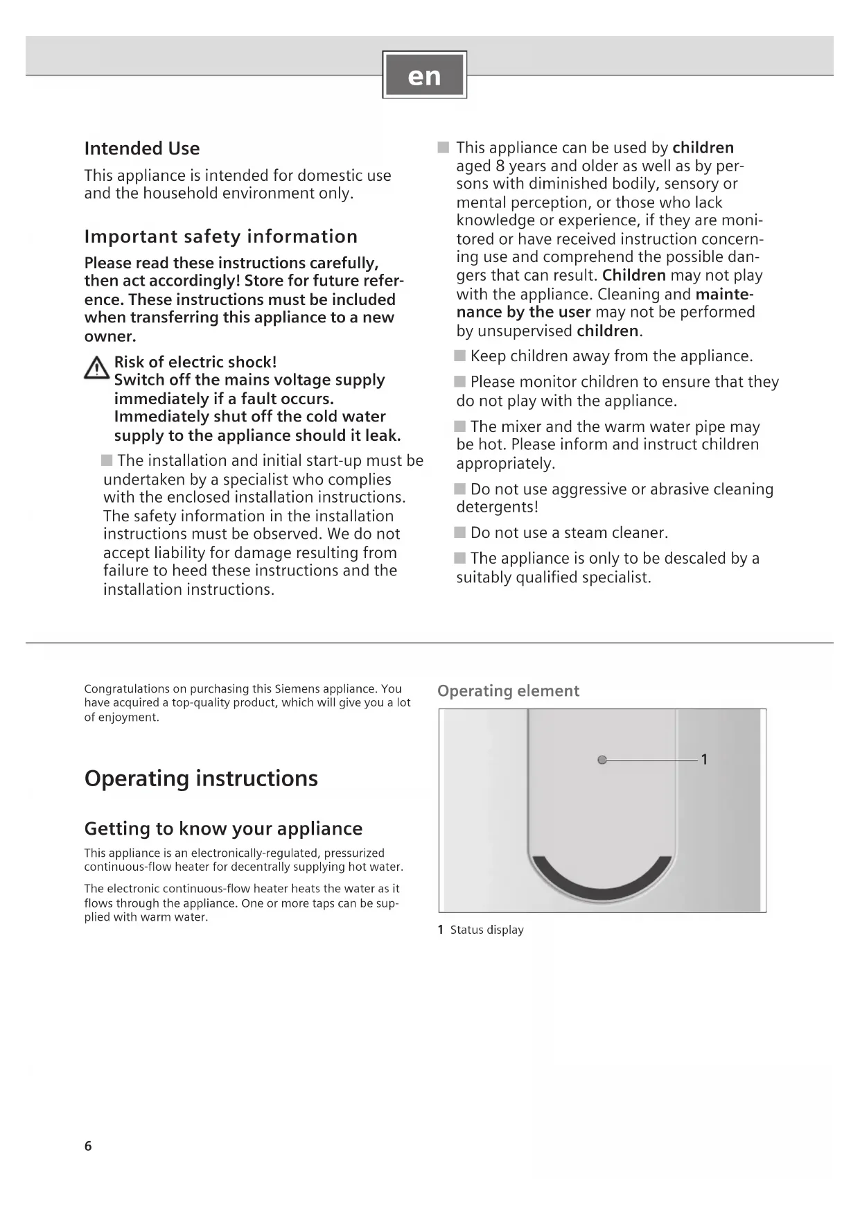 Intended Use This appliance is intended for domestic use and the household environment only. Important safety information Please read these instructions carefully, then act accordingly! Store for future refer- ence. These instructions must be included when transferring this appliance to a new owner. Risk of electric shock! Switch off the mains voltage supply immediately if a fault occurs. Immediately shut off the cold water supply to the appliance should it leak. ■ The installation and initial start-up must be undertaken by a specialist who complies with the enclosed installation instructions. The safety information in the installation instructions must be observed. We do not accept liability for damage resulting from failure to heed these instructions and the installation instructions. ■ This appliance can be used by children aged 8 years and older as well as by per- sons with diminished bodily, sensory or mental perception, or those who lack knowledge or experience, if they are moni- tored or have received instruction concern- ing use and comprehend the possible dan- gers that can result. Children may not play with the appliance. Cleaning and mainte- nance by the user may not be performed by unsupervised children. ■ Keep children away from the appliance. ■ Please monitor children to ensure that they do not play with the appliance. ■ The mixer and the warm water pipe may be hot. Please inform and instruct children appropriately. ■ Do not use aggressive or abrasive cleaning detergents! ■ Do not use a steam cleaner. ■ The appliance is only to be descaled by a suitably qualified specialist. Congratulations on purchasing this Siemens appliance. You have acquired a top-quality product, which will give you a lot of enjoyment. Operating instructions Getting to know your appliance This appliance is an electronically-regulated, pressurized continuous-flow heater for decentrally supplying hot water.The electronic continuous-flow heater heats the water as it flows through the appliance. One or more taps can be sup-plied with warm water. Operating element