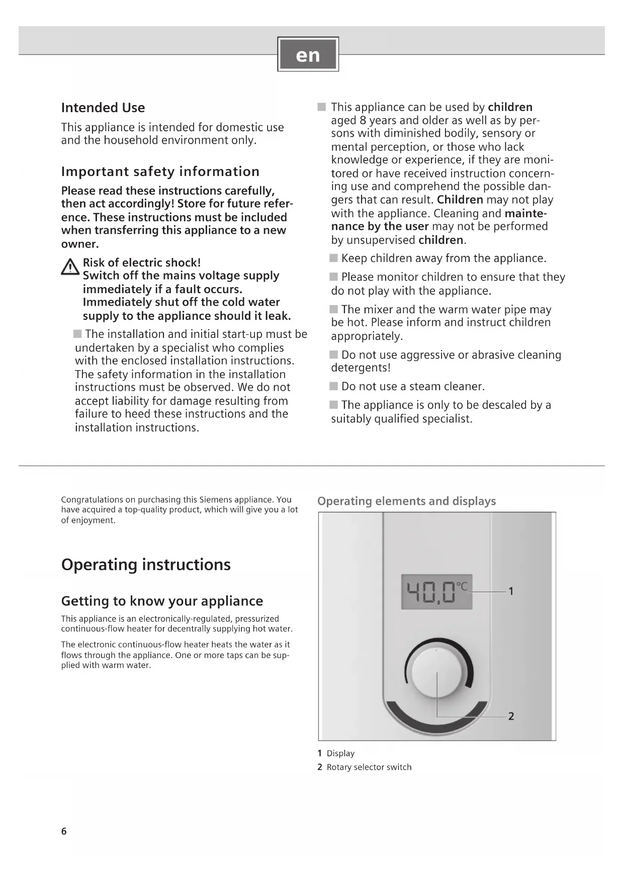 Intended Use This appliance is intended for domestic use and the household environment only. Important safety information Please read these instructions carefully, then act accordingly! Store for future refer- ence. These instructions must be included when transferring this appliance to a new owner. Risk of electric shock! Switch off the mains voltage supply immediately if a fault occurs. Immediately shut off the cold water supply to the appliance should it leak. ■ The installation and initial start-up must be undertaken by a specialist who complies with the enclosed installation instructions. The safety information in the installation instructions must be observed. We do not accept liability for damage resulting from failure to heed these instructions and the installation instructions. ■ This appliance can be used by children aged 8 years and older as well as by per- sons with diminished bodily, sensory or mental perception, or those who lack knowledge or experience, if they are moni- tored or have received instruction concern- ing use and comprehend the possible dan- gers that can result. Children may not play with the appliance. Cleaning and mainte- nance by the user may not be performed by unsupervised children. ■ Keep children away from the appliance. ■ Please monitor children to ensure that they do not play with the appliance. ■ The mixer and the warm water pipe may be hot. Please inform and instruct children appropriately. ■ Do not use aggressive or abrasive cleaning detergents! ■ Do not use a steam cleaner. ■ The appliance is only to be descaled by a suitably qualified specialist. Congratulations on purchasing this Siemens appliance. You have acquired a top-quality product, which will give you a lot of enjoyment. Operating instructions Getting to know your appliance This appliance is an electronically-regulated, pressurized continuous-flow heater for decentrally supplying hot water.The electronic continuous-flow heater heats the water as it flows through the appliance. One or more taps can be sup-plied with warm water. Operating elements and displays