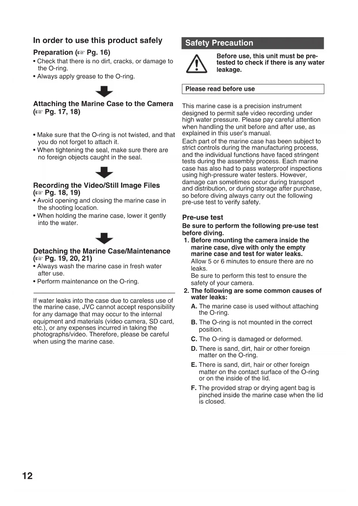 water leaks: Safety Precaution Please read before use A. The marine case is used without attaching the O-ring. B. The O-ring is not mounted in the correct position. C. The O-ring is damaged or deformed. D. There is sand, dirt, hair or other foreign matter on the O-ring. E. There is sand, dirt, hair or other foreign matter on the contact surface of the O-ring or on the inside of the lid. F. The provided strap or drying agent bag is pinched inside the marine case when the lid is closed. WR-MG270_EN.book Page 12 Wednesday, March 24, 2010 1:36 PM13 3. Check that there are no scratches or cracks on the marine case every time you use it.The marine case must withstand water pressure with use. Repeated exposure to pressure eventually leads to material fatigue, which may result in damage of the marine case. Every time you use the marine case, check in advance that there are no scratches or cracks. If you frequently use the marine case, be sure to ask for maintenance at the store of purchase. (There is a charge for maintenance.)To protect your camera and ensure optimum use, keep the examples listed above in mind when using the marine case.JVC accepts no responsibility for water leakage or damage to anything inside the marine case (camera, SD card, etc.) due to careless usage of this product. Be sure to follow correct procedures when using the marine case.• Anti-fog liquid• Silicone grease (5 g) x 1• Silicone cloth• Drying agent (2 g) x 5• StrapYou can purchase the following set of expendable parts.Please contact your local JVC service representative.• O-rings x 2• Silicone grease (5 g) x 1• Drying agent (2 g) x 5• Lens tissue paper (50 sheets) x 1• Power button cap x 2 Accessories