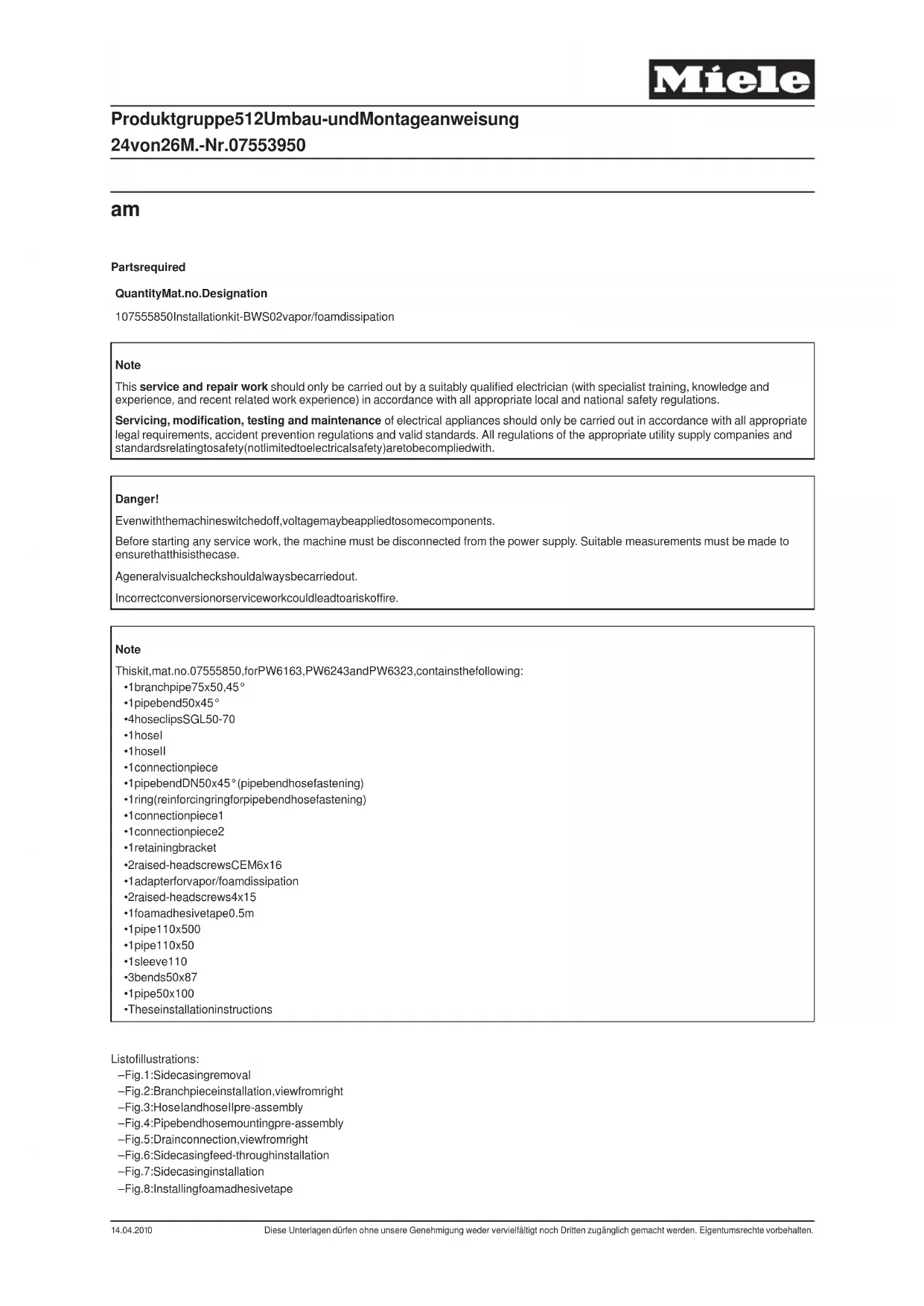 Quantity Mat. no. Designation 1 07555850 Installation kit - BWS 02 vapor/foam dissipation Note This service and repair work should only be carried out by a suitably qualified electrician (with specialist training, knowledge and experience, and recent related work experience) in accordance with all appropriate local and national safety regulations. Servicing, modification, testing and maintenance of electrical appliances should only be carried out in accordance with all appropriate legal requirements, accident prevention regulations and valid standards. All regulations of the appropriate utility supply companies and standards relating to safety (not limited to electrical safety) are to be complied with. Danger! Even with the machine switched of f, voltage may be applied to some components. Before starting any service work, the machine must be disconnected from the power supply. Suitable measurements must be made to ensure that this is the case. A general visual check should always be carried out. Incorrect conversion or service work could lead to a risk of fire. Note This kit, mat. no. 07555850, for PW 6163, PW 6243 and PW 6323, contains the following: