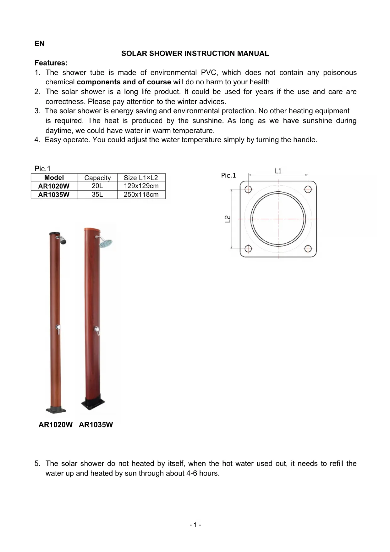 - The solar shower is a long life product. It could be used for years if the use and care are correctness. Please pay attention to the winter advices.