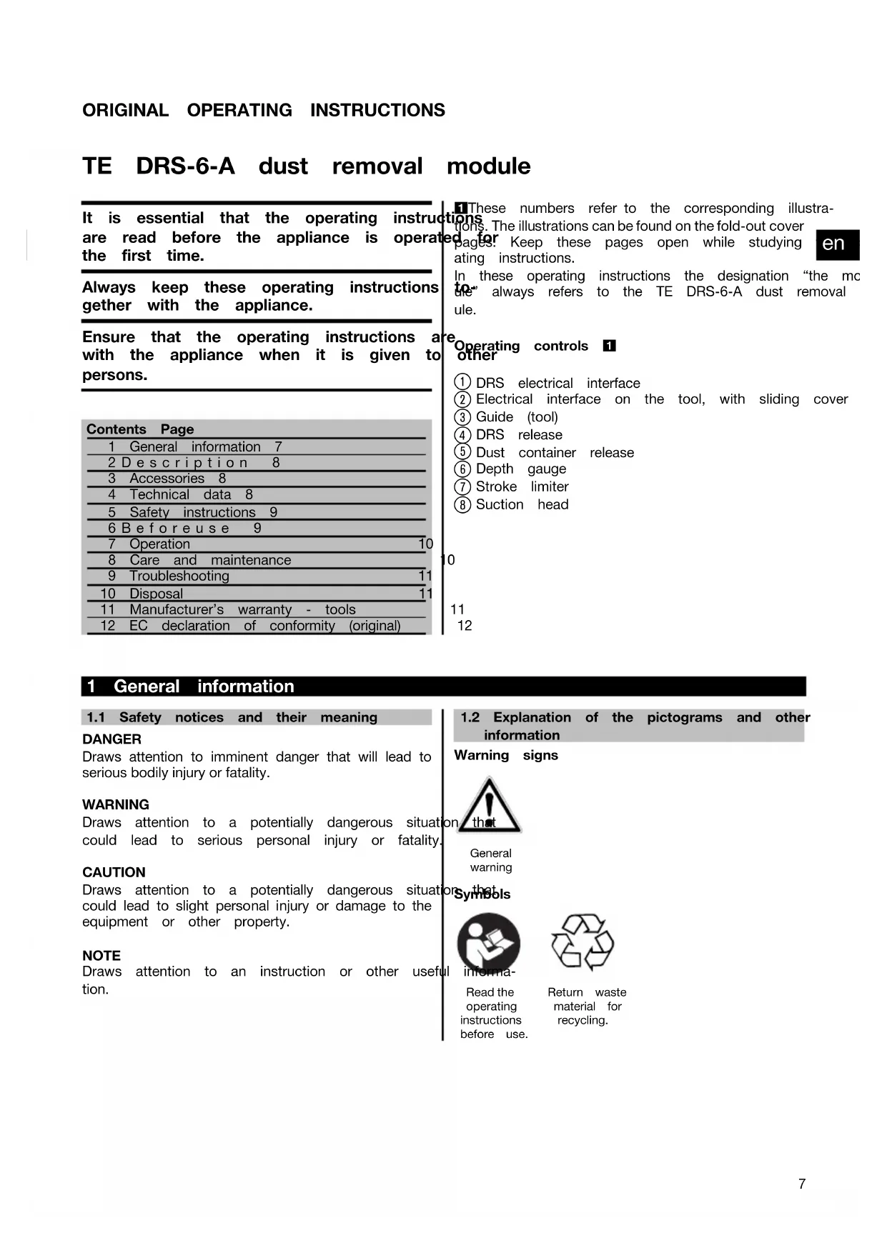 - Muss beim Arbeitsablauf von diesem geprüften Verfah- ren abgewichen werden, ist die Arbeit zu unterbrechen und der sachkundige Verantwortliche zwecks Abstim- mung der weiteren Vorgehensweise zu verständigen. Berufsgenossenschaftliches Institut für Arbeitssicherheit Printed: 08.07.2013 | Doc-Nr: PUB / 5071244 / 000 / 02ORIGINAL OPERATING INSTRUCTIONS TE DRS‑6‑A dust removal module It is essential that the operating instructions are read before the appliance is operated for the first time. Always keep these operating instructions to- gether with the appliance. Ensure that the operating instructions are with the appliance when it is given to other persons. Contents Page1 General information 72Description 83 Accessories 84 Technical data 85 Safety instructions 96Beforeuse 97 Operation 108 Care and maintenance 109 Troubleshooting 1110 Disposal 1111 Manufacturer’s warranty - tools 1112 EC declaration of conformity (original) 121 These numbers refer to the corresponding illustra- tions. The illustrations can be found on the fold-out cover pages. Keep these pages open while studying the oper-ating instructions.In these operating instructions the designation “the mod-ule” always refers to the TE DRS-6-A dust removal mod- ule. Operating controls 1 DRS electrical interface Electrical interface on the tool, with sliding cover Guide (tool) DRS release Dust container release Depth gauge Stroke limiter Suction head 1 General information