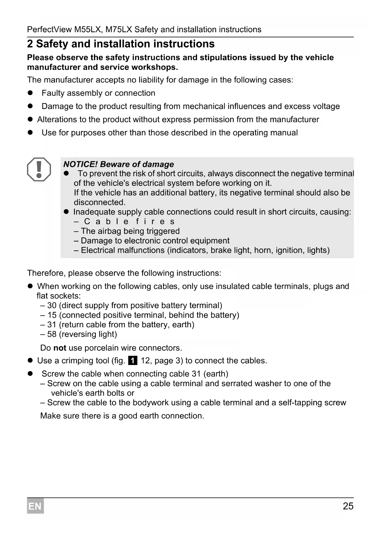 Therefore, please observe the following instructions: When working on the following cables, only use insulated cable terminals, plugs and flat sockets: – 30 (direct supply from positive battery terminal) – 15 (connected positive terminal, behind the battery) – 31 (return cable from the battery, earth) – 58 (reversing light) Do not use porcelain wire connectors. Use a crimping tool (fig. 1 12, page 3) to connect the cables. Screw the cable when connecting cable 31 (earth) – Screw on the cable using a cable terminal and serrated washer to one of the vehicle's earth bolts or – Screw the cable to the bodywork using a cable terminal and a self-tapping screw Make sure there is a good earth connection. NOTICE! Beware of damage To prevent the risk of short circuits, always disconnect the negative terminal of the vehicle's electrical system before working on it. If the vehicle has an additional battery, its negative terminal should also be disconnected. Inadequate supply cable connections could result in short circuits, causing: –Cable fires – The airbag being triggered – Damage to electronic control equipment – Electrical malfunctions (indicators, brake light, horn, ignition, lights)Safety and installation instructions PerfectView M55LX, M75LX