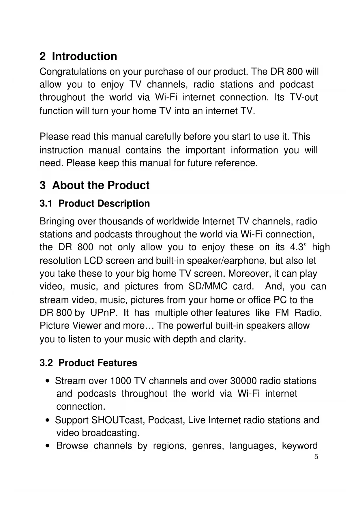 Congratulations on your purchase of our product. The DR 800 will allow you to enjoy TV channels, radio stations and podcast throughout the world via Wi-Fi internet connection. Its TV-out function will turn your home TV into an internet TV.