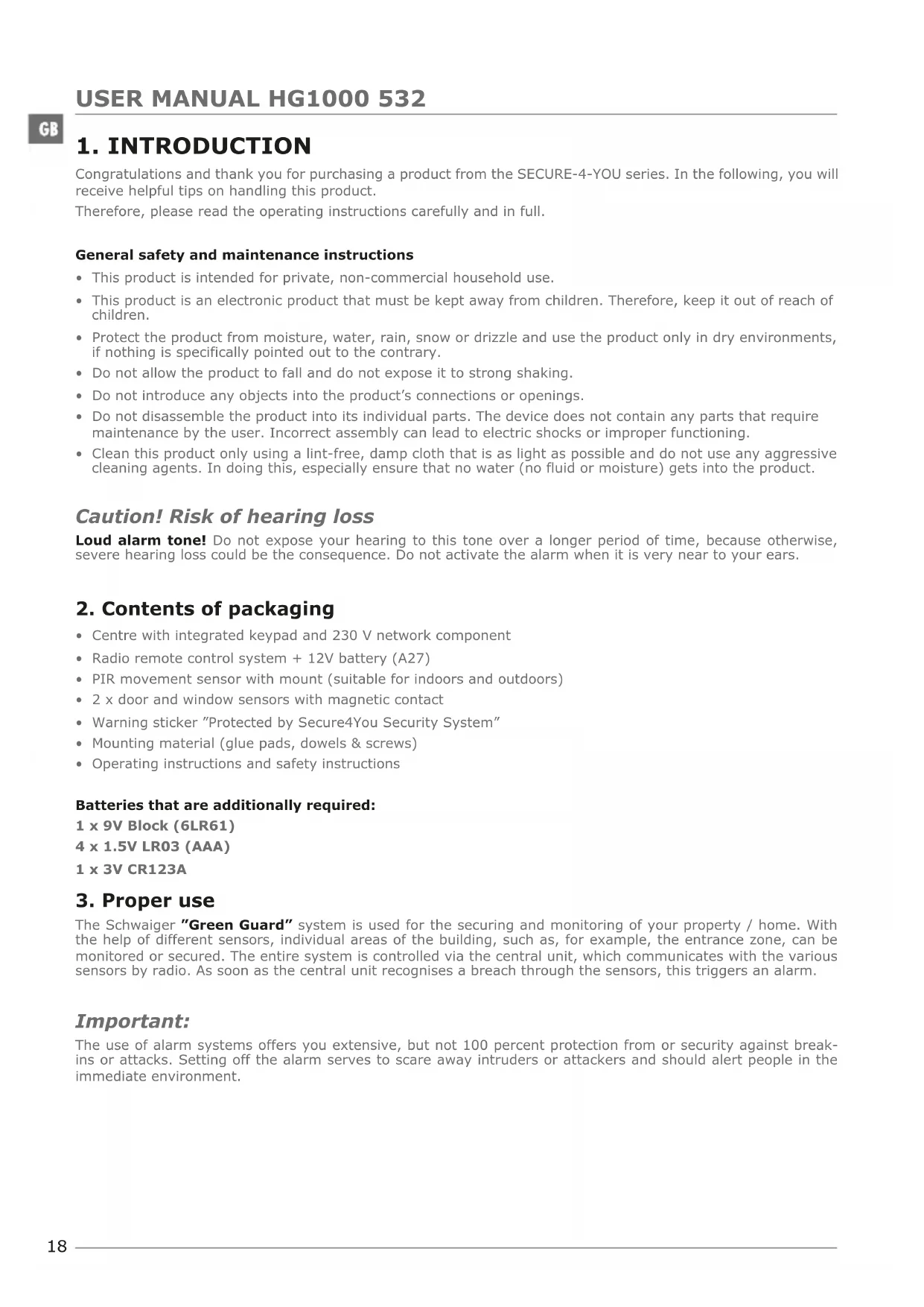 Download the instructions for your Alarm system in PDF format for free! Find your manual HG1000 532 - Schwaiger and take your electronic device back in hand. On this page are published all the documents necessary for the use of your device. HG1000 532 by Schwaiger.