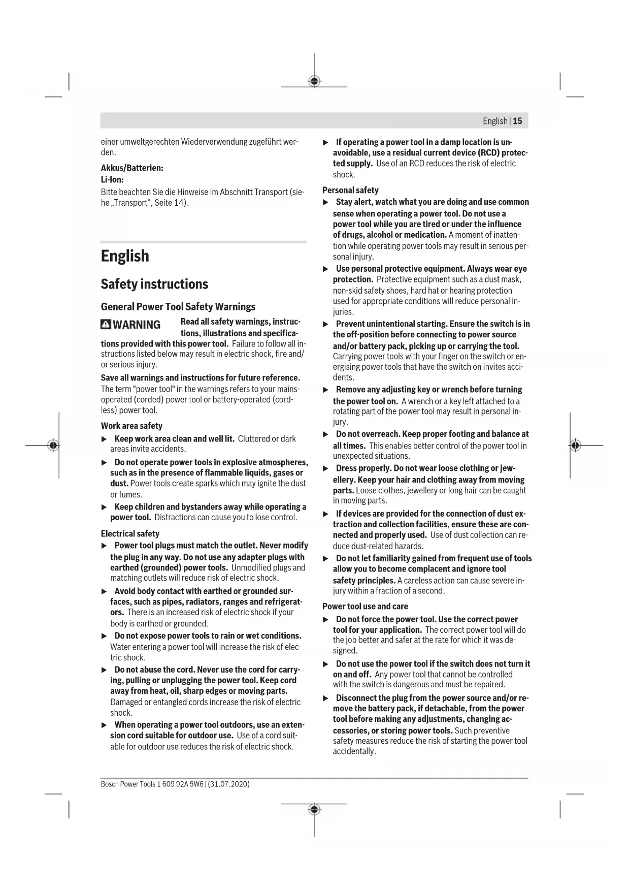 The vibration level and noise emission value given in these instructions have been measured in accordance with a standardised measuring procedure and may be used to com- pare power tools. They may also be used for a preliminary estimation of vibration and noise emissions. The stated vibration level and noise emission value repres- ent the main applications of the power tool. However, if the power tool is used for other applications, with different ap- plication tools or is poorly maintained, the vibration level and noise emission value may differ. This may significantly increase the vibration and noise emissions over the total working period. To estimate vibration and noise emissions accurately, the times when the tool is switched off or when it is running but not actually being used should also be taken into account. This may significantly reduce vibration and noise emissions over the total working period. Implement additional safety measures to protect the oper- ator from the effects of vibration, such as servicing the power tool and application tools, keeping their hands warm, and organising workflows correctly. Fitting Battery charging u Use only the chargers listed in the technical data. Only these chargers are matched to the lithium-ion battery of your power tool. Note: The battery is supplied partially charged. To ensure full battery capacity, fully charge the battery in the charger before using your power tool for the first time. The lithium-ion battery can be charged at any time without reducing its service life. Interrupting the charging process does not damage the battery. The lithium-ion battery is protected against deep discharge by the "Electronic Cell Protection (ECP)". When the battery is discharged, the power tool is switched off by means of a protective circuit: The application tool no longer rotates. u Do not continue to press the On/Off switch after the power tool has automatically switched off. The battery can be damaged. Removing the battery To remove the battery , press the battery release button and pull the battery to the rear and out of the power tool. Do not use force to do this. Battery charge indicator When the on/off switch (14) is pressed in halfway or com- pletely, the battery charge-control indicator (13) indicates the charge condition of the battery for several seconds. The indicator consists of three green LEDs. 1 609 92A 5W6 | (31.07.2020) Bosch Power ToolsEnglish | 19 LED Capacity Continuous lighting 3x green ≥ 66% Continuous lighting 2x green 33–66% Continuous lighting 1x green 11–33% Slowly flashing light 1 x green ≤ 10% The three LEDs in the battery charge indicator flash quickly when the temperature of the battery is outside the operating temperature range of –30 to +65 °C and/or the overload protection has been triggered. Changing the Tool Inserting the application tool (seefigureA) Insert the application tool all the way into the tool holder (2). The application tool is held in the tool holder by means of a magnet. Removing Remove the application tool from the tool holder (2). Fitting the adapter (see figure B) Remove the application tool. Insert the adapter into the tool holder (2). The adapter clicks audibly into place. Check that it is seated securely by pulling the adapter. Inserting the application tool into the adapter (see figure