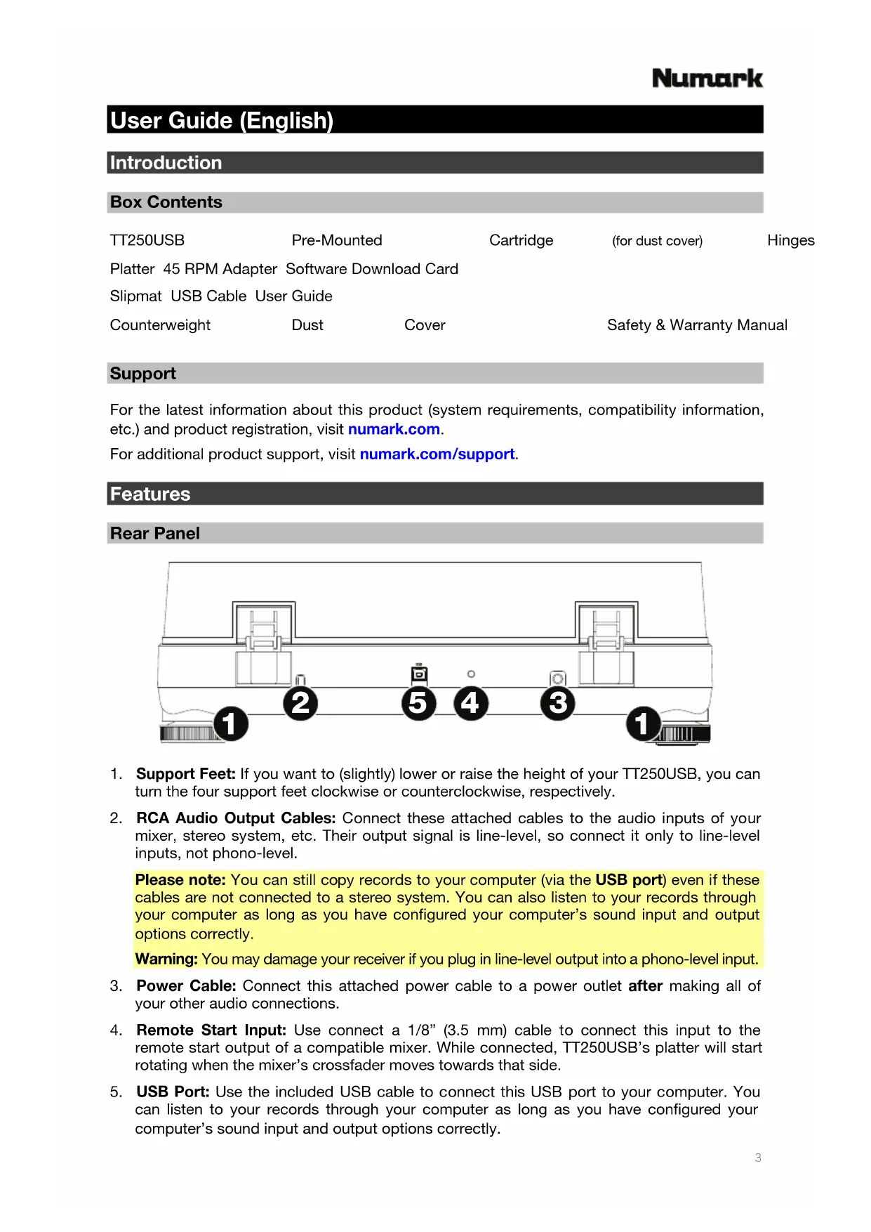 User Guide (English) Introduction Box Contents TT250USB Pre-Mounted Cartridge Hinges (for dust cover) Platter 45 RPM Adapter Software Download Card Slipmat USB Cable User Guide Counterweight Dust Cover Safety & Warranty Manual Support For the latest information about this product (system requirements, compatibility information, etc.) and product registration, visit numark.com. For additional product support, visit numark.com/support. Features Rear Panel