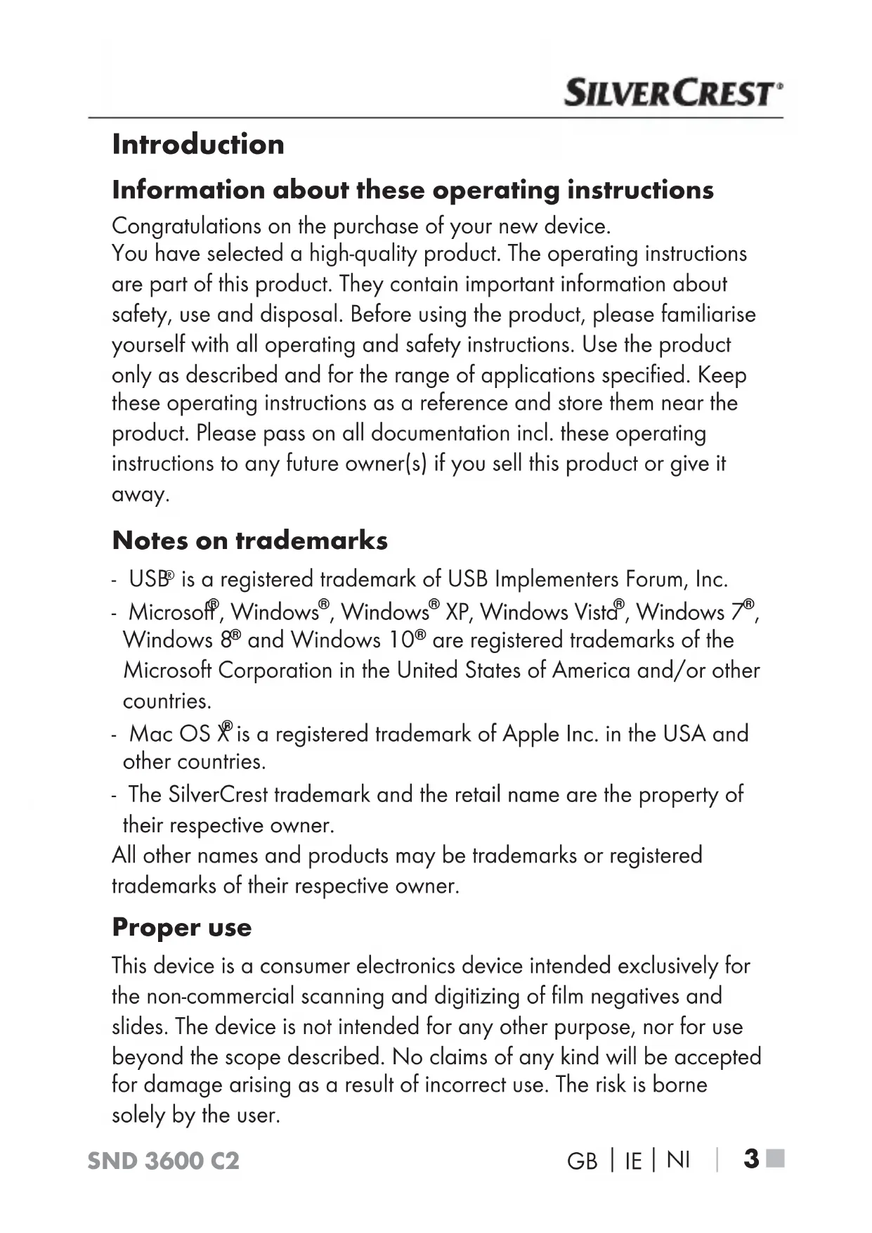 is a registered trademark of Apple Inc. in the USA and other countries. - The SilverCrest trademark and the retail name are the property of their respective owner. All other names and products may be trademarks or registered trademarks of their respective owner. Proper use This device is a consumer electronics device intended exclusively for the non-commercial scanning and digitizing of film negatives and slides. The device is not intended for any other purpose, nor for use beyond the scope described. No claims of any kind will be accepted for damage arising as a result of incorrect use. The risk is borne solely by the user.SND 3600 C2 ■ 4