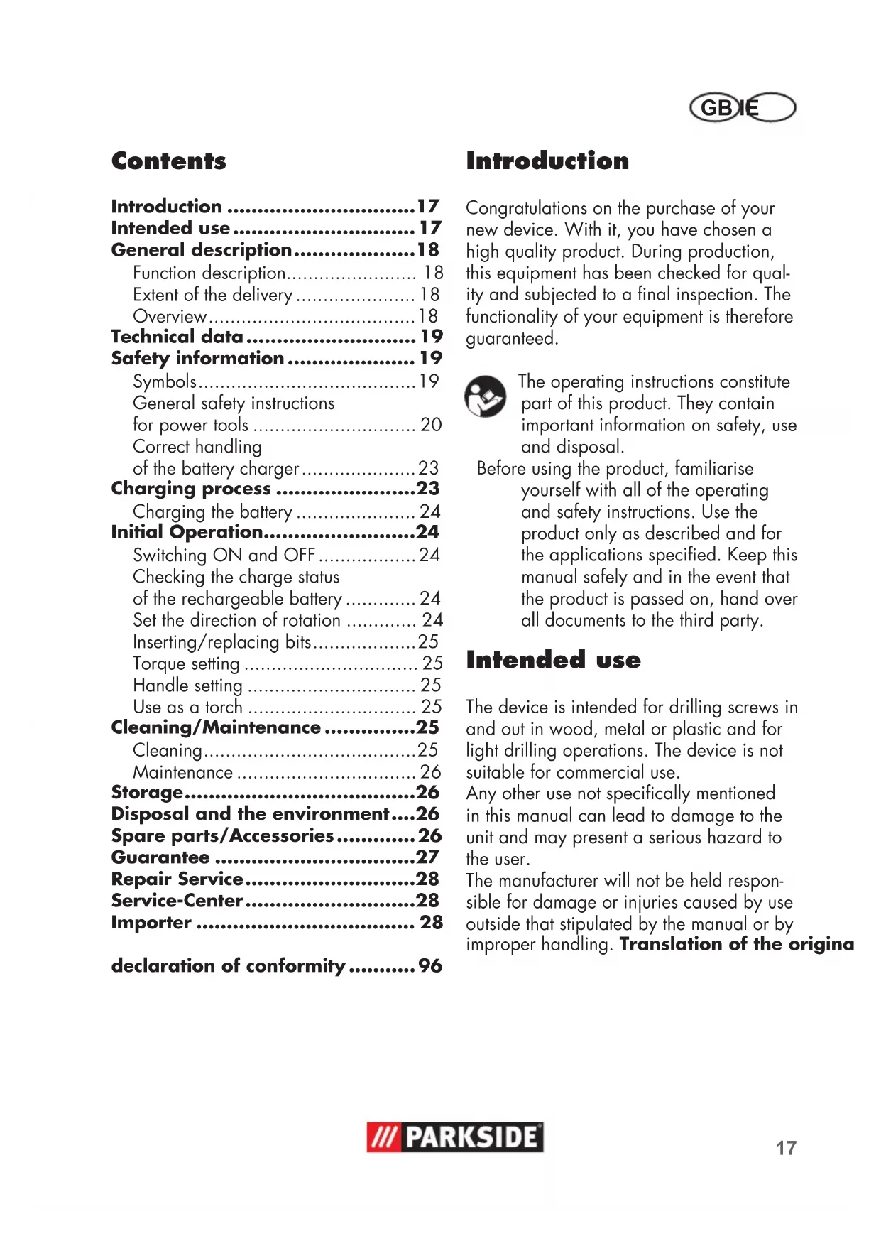 - Introduction Congratulations on the purchase of your new device. With it, you have chosen a high quality product. During production, this equipment has been checked for qual- ity and subjected to a nal inspection. The functionality of your equipment is therefore guaranteed. The operating instructions constitute part of this product. They contain important information on safety, use and disposal. Before using the product, familiarise yourself with all of the operating and safety instructions. Use the product only as described and for the applications specied. Keep this manual safely and in the event that the product is passed on, hand over all documents to the third party. Intended use The device is intended for drilling screws in and out in wood, metal or plastic and for light drilling operations. The device is not suitable for commercial use. Any other use not specically mentioned in this manual can lead to damage to the unit and may present a serious hazard to the user. The manufacturer will not be held respon- sible for damage or injuries caused by use outside that stipulated by the manual or by improper handling. Translation of the original EC declaration of conformity GB IE p. 96