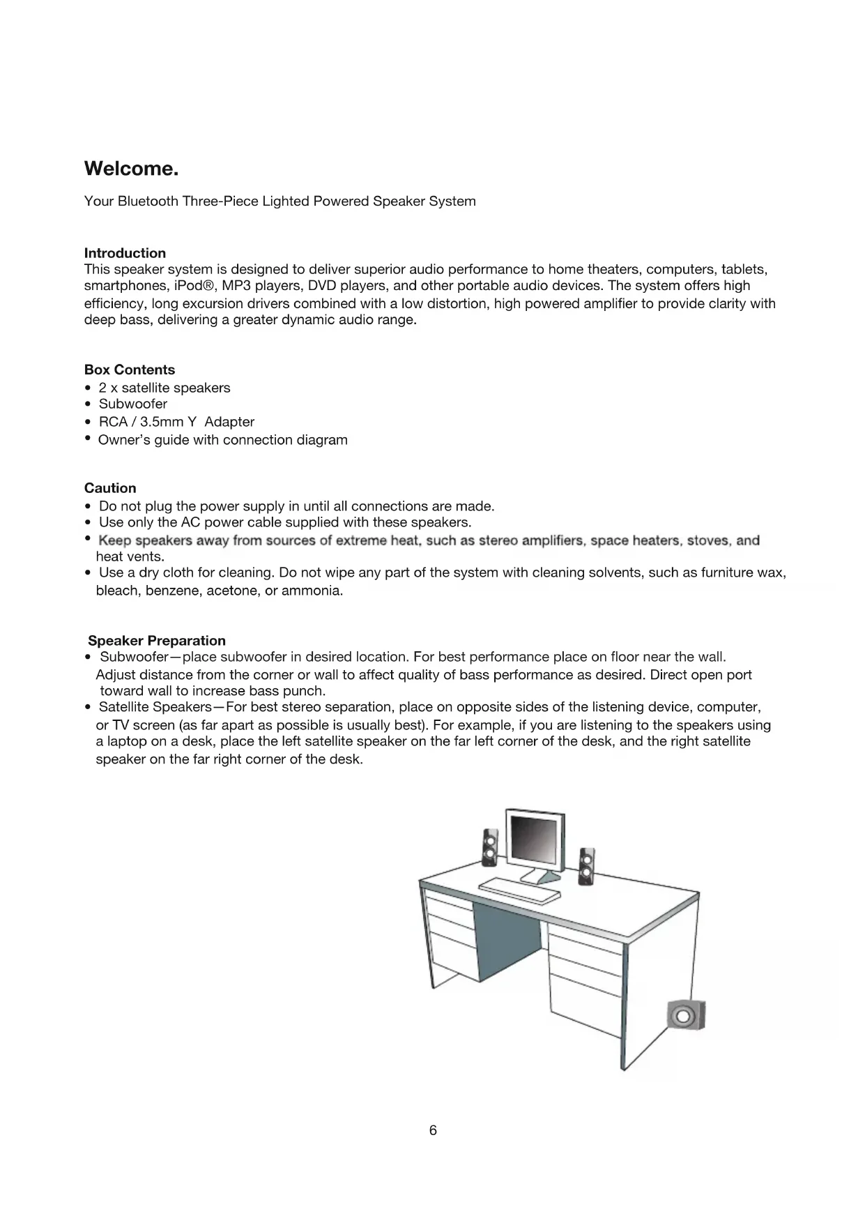 This speaker system is designed to deliver superior audio performance to home theaters, computers, tablets, smartphones, iPod®, MP3 players, DVD players, and other portable audio devices. The system offers high efficiency, long excursion drivers combined with a low distortion, high powered amplifier to provide clarity with deep bass, delivering a greater dynamic audio range.