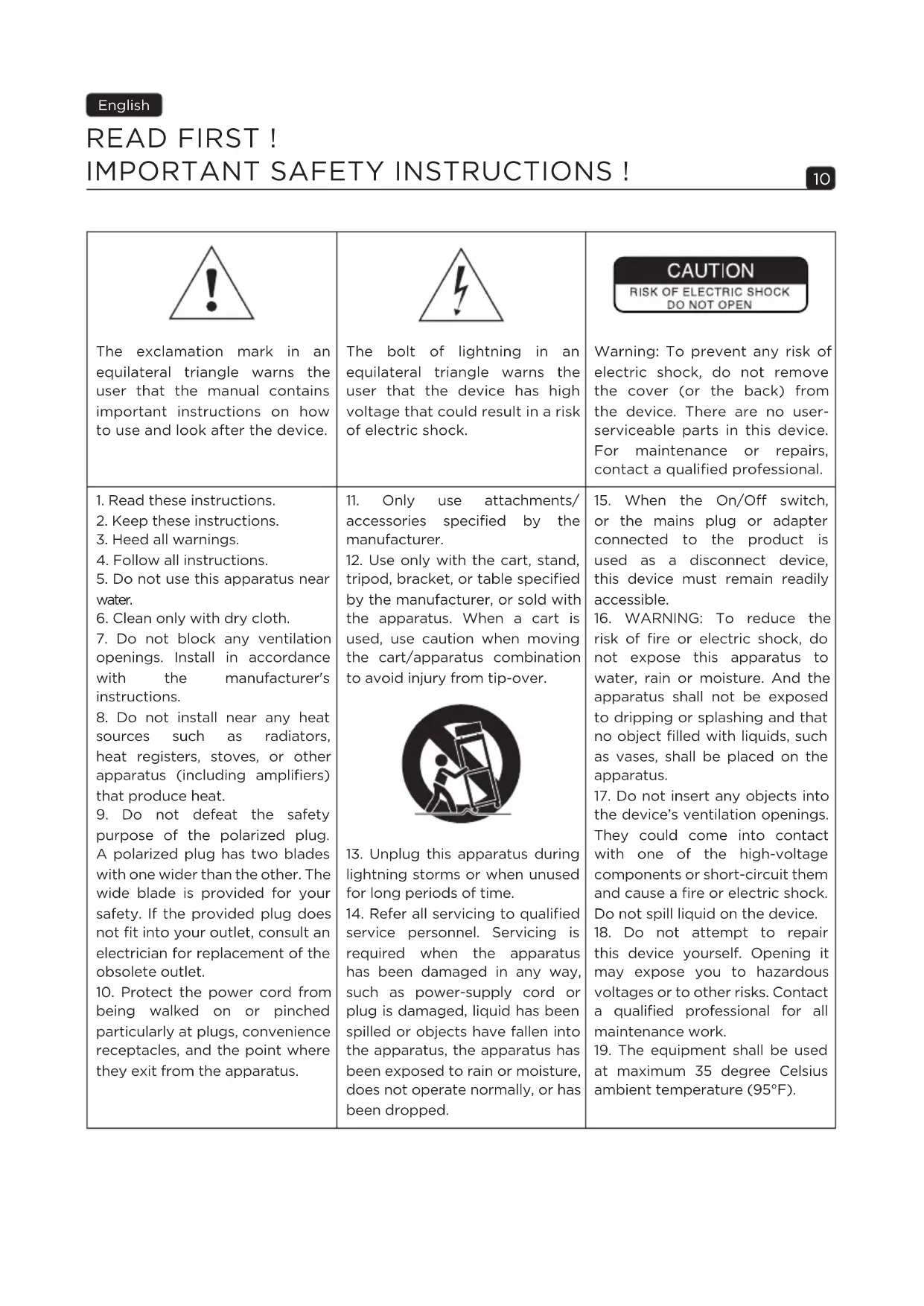 risk of fire or electric shock, do not expose this apparatus to water, rain or moisture. And the apparatus shall not be exposed to dripping or splashing and that no object filled with liquids, such as vases, shall be placed on the apparatus.