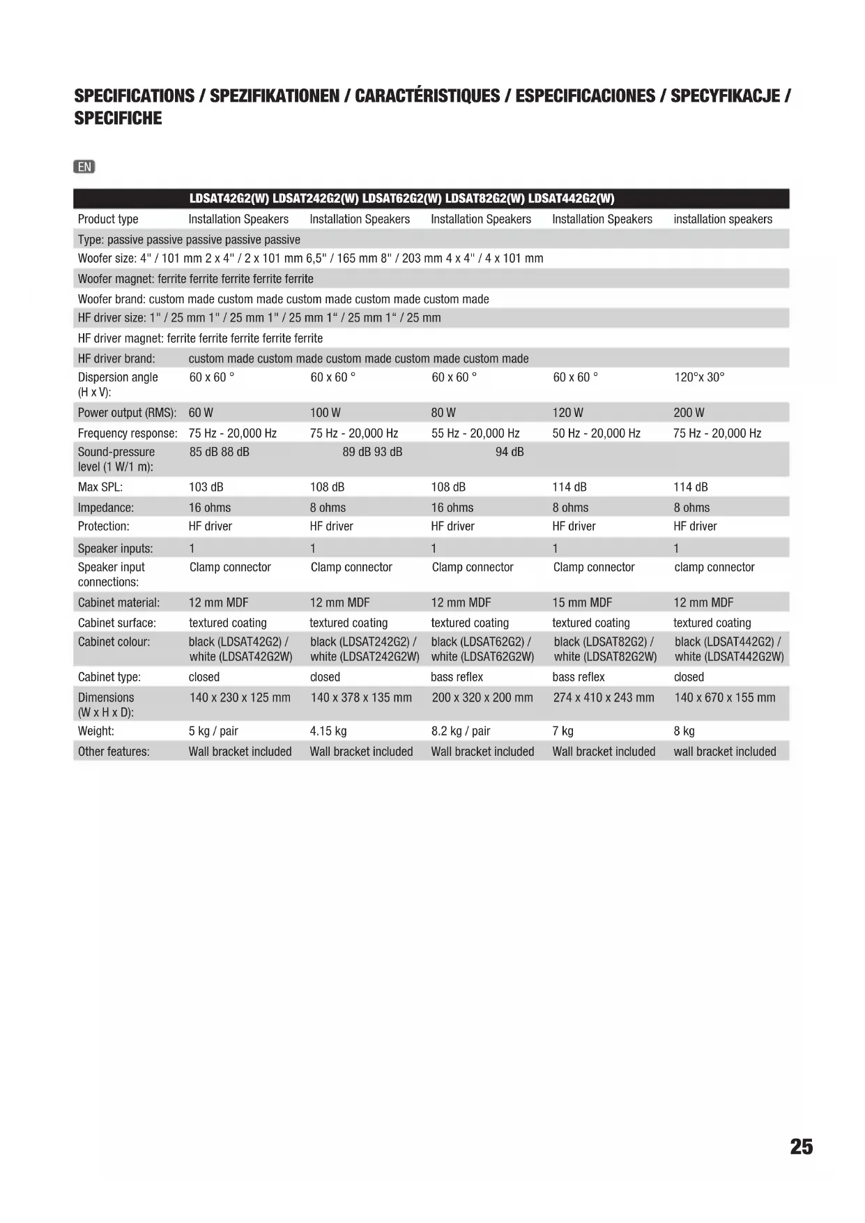 SPECIFICHE LDSAT42G2(W) LDSAT242G2(W) LDSAT62G2(W) LDSAT82G2(W) LDSAT442G2(W) Product type Installation Speakers Installation Speakers Installation Speakers Installation Speakers installation speakers Type: passive passive passive passive passive Woofer size: 4" / 101 mm 2 x 4" / 2 x 101 mm 6,5" / 165 mm 8" / 203 mm 4 x 4" / 4 x 101 mm Woofer magnet: ferrite ferrite ferrite ferrite ferrite Woofer brand: custom made custom made custom made custom made custom made HF driver size: 1" / 25 mm 1" / 25 mm 1" / 25 mm 1“ / 25 mm 1“ / 25 mm HF driver magnet: ferrite ferrite ferrite ferrite ferrite HF driver brand: custom made custom made custom made custom made custom made Dispersion angle (H x V): 60 x 60 ° 60 x 60 ° 60 x 60 ° 60 x 60 ° 120°x 30° Power output (RMS): 60 W 100 W 80 W 120 W 200 W Frequency response: 75 Hz - 20,000 Hz 75 Hz - 20,000 Hz 55 Hz - 20,000 Hz 50 Hz - 20,000 Hz 75 Hz - 20,000 Hz Sound-pressure level (1 W/1 m): 85 dB 88 dB 89 dB 93 dB 94 dB Max SPL: 103 dB 108 dB 108 dB 114 dB 114 dB Impedance: 16 ohms 8 ohms 16 ohms 8 ohms 8 ohms Protection: HF driver HF driver HF driver HF driver HF driver Speaker inputs: 1 1 1 1 1 Speaker input connections: Clamp connector Clamp connector Clamp connector Clamp connector clamp connector Cabinet material: 12 mm MDF 12 mm MDF 12 mm MDF 15 mm MDF 12 mm MDF Cabinet surface: textured coating textured coating textured coating textured coating textured coating Cabinet colour: black (LDSAT42G2) / white (LDSAT42G2W) black (LDSAT242G2) / white (LDSAT242G2W) black (LDSAT62G2) / white (LDSAT62G2W) black (LDSAT82G2) / white (LDSAT82G2W) black (LDSAT442G2) / white (LDSAT442G2W) Cabinet type: closed closed bass reflex bass reflex closed Dimensions (W x H x D): 140 x 230 x 125 mm 140 x 378 x 135 mm 200 x 320 x 200 mm 274 x 410 x 243 mm 140 x 670 x 155 mm Weight: 5 kg / pair 4.15 kg 8.2 kg / pair 7 kg 8 kg Other features: Wall bracket included Wall bracket included Wall bracket included Wall bracket included wall bracket included EN26 LDSUB88 Product type: Installation Subwoofers Type: passive Woofer size: 2 x 8" / 2 x 203 mm Woofer magnet: ferrite Woofer brand: custom made Power output (RMS): 200 (2x100)W Frequency response: 40 Hz - 120 Hz Sound-pressure level (1 W/1 m): 92 dB Max SPL: 115 dB Impedance: 2 x 8 ohms Speaker inputs: 2 Speaker input connections: Clamp connector Speaker outputs: 2 Speaker output connections: Clamp connector Cabinet material: 15 mm MDF Cabinet surface: textured coating Cabinet colour: black Cabinet type: band pass Dimensions (W x H x D): 600 x 250 x 350 mm Weight: 13.3 kg Other features: internal low-pass filter (120 Hz) LDSAT62AG2(W) LDSAT82AG2(W) Product type: Installation Speakers installation speakers Type: active active Woofer size: 6,5" / 165 mm 8" / 203.2 mm Woofer magnet: ferrite ferrite Woofer brand: custom made custom made HF driver size: 1“ / 25 mm 1“ / 25 mm HF driver magnet: ferrite ferrite HF driver brand: custom made custom made Amplifier: Class A/B class A/B Dispersion angle (H x V): 60 x 60 ° 60° x 60° Power output (RMS): 50 W 80 W Frequency response: 55 Hz - 20,000 Hz 50 Hz - 20,000 Hz Max SPL: 108 dB 114 dB Protection: HF driver, overcurrent overcurrent, HF drivers Controls: Power switch (on/off), volume control, switcha- ble auto-power mode volume, power switch (on/off), power mode (on/auto) Indicators: Power Power, Limit Line input connectors: XLR, 6.3 mm TRS (combo)