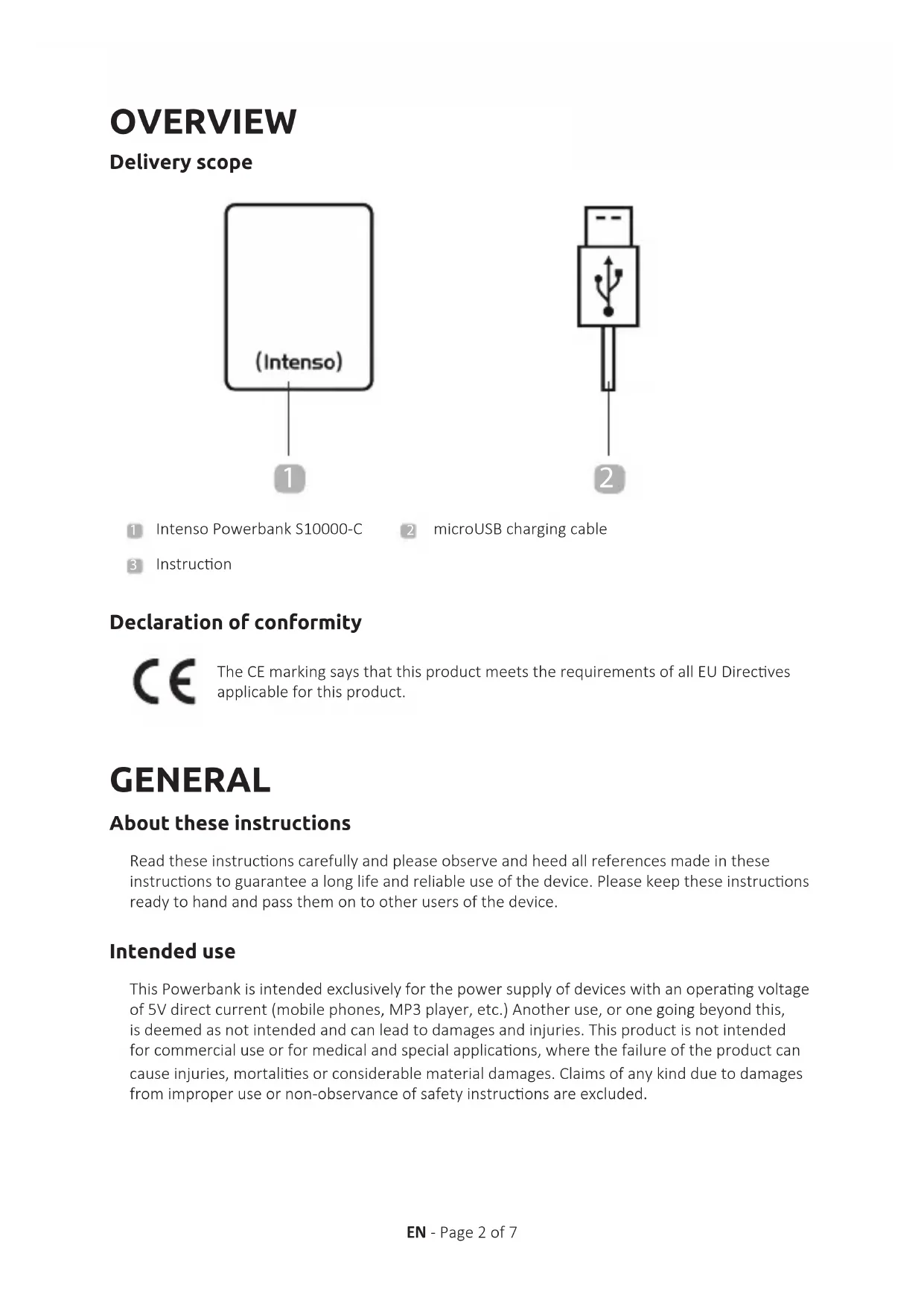 Read these instrucons carefully and please observe and heed all references made in these instrucons to guarantee a long life and reliable use of the device. Please keep these instrucons ready to hand and pass them on to other users of the device. About these instructions GENERAL Declaration of conformity The CE marking says that this product meets the requirements of all EU Direcves applicable for this product. Delivery scope OVERVIEW This Powerbank is intended exclusively for the power supply of devices with an operang voltage of 5V direct current (mobile phones, MP3 player, etc.) Another use, or one going beyond this, is deemed as not intended and can lead to damages and injuries. This product is not intended for commercial use or for medical and special applicaons, where the failure of the product can cause injuries, mortalies or considerable material damages. Claims of any kind due to damages from improper use or non-observance of safety instrucons are excluded. Intended useEN - Page 3 of 7 Device overview USE