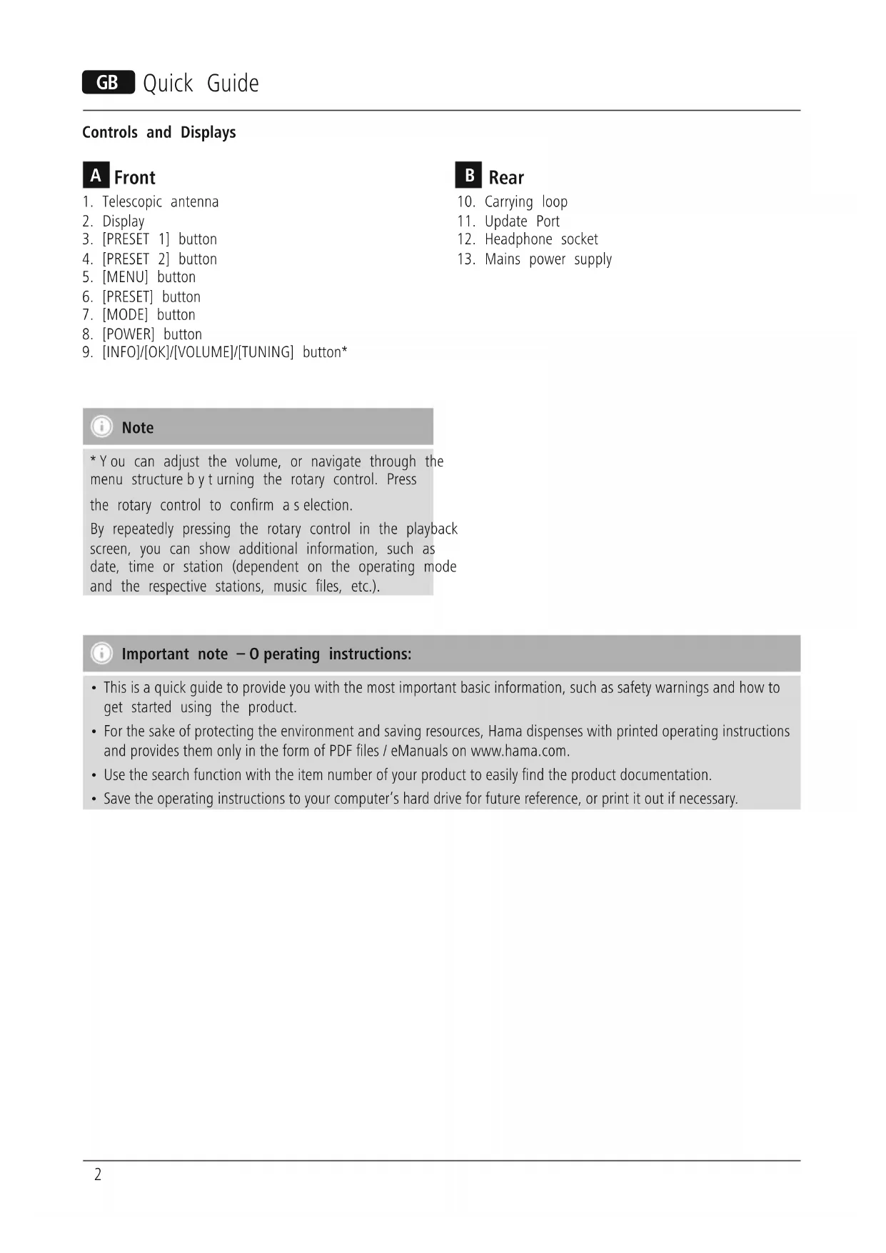G Quick Guide Controls and Displays Note *You can adjust the volume, or navigate through the menu structurebyturning the rotary control. Press the rotary control to conrm aselection. By repeatedly pressing the rotary control in the playback screen, you can show additional information, such as date, time or station (dependent on the operating mode and the respective stations, music les, etc.). Important note –Operating instructions: