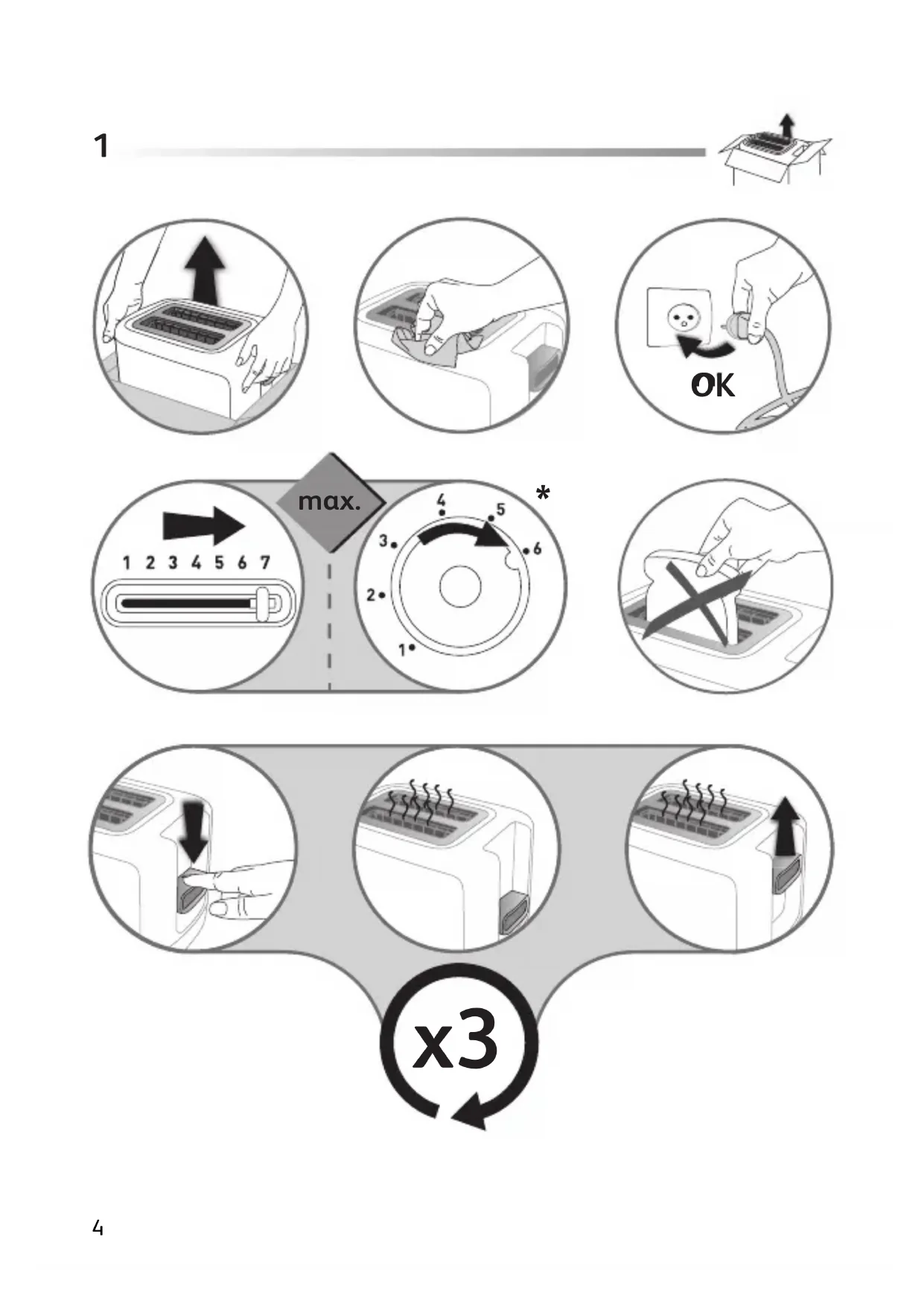 - If the bread jams in the slots after toasting and the elements do not switch off, unplug the plug immediately and wait for the appliance to cool before attempting to remove the bread.