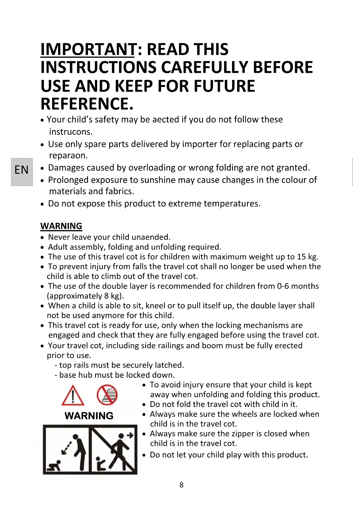 Your child’s safety may be affected if you do not follow these instructions. Use only spare parts delivered by importer for replacing parts or reparation. Damages caused by overloading or wrong folding are not granted. Prolonged exposure to sunshine may cause changes in the colour of materials and fabrics. Do not expose this product to extreme temperatures. WARNING Never leave your child unattended. Adult assembly, folding and unfolding required. The use of this travel cot is for children with maximum weight up to 15 kg. To prevent injury from falls the travel cot shall no longer be used when the child is able to climb out of the travel cot. The use of the double layer is recommended for children from 0-6 months (approximately 8 kg). When a child is able to sit, kneel or to pull itself up, the double layer shall not be used anymore for this child. This travel cot is ready for use, only when the locking mechanisms are engaged and check that they are fully engaged before using the travel cot. Your travel cot, including side railings and bottom must be fully erected prior to use. - top rails must be securely latched. - base hub must be locked down. To avoid injury ensure that your child is kept away when unfolding and folding this product. Do not fold the travel cot with child in it. Always make sure the wheels are locked when child is in the travel cot. Always make sure the zipper is closed when child is in the travel cot. Do not let your child play with this product.
