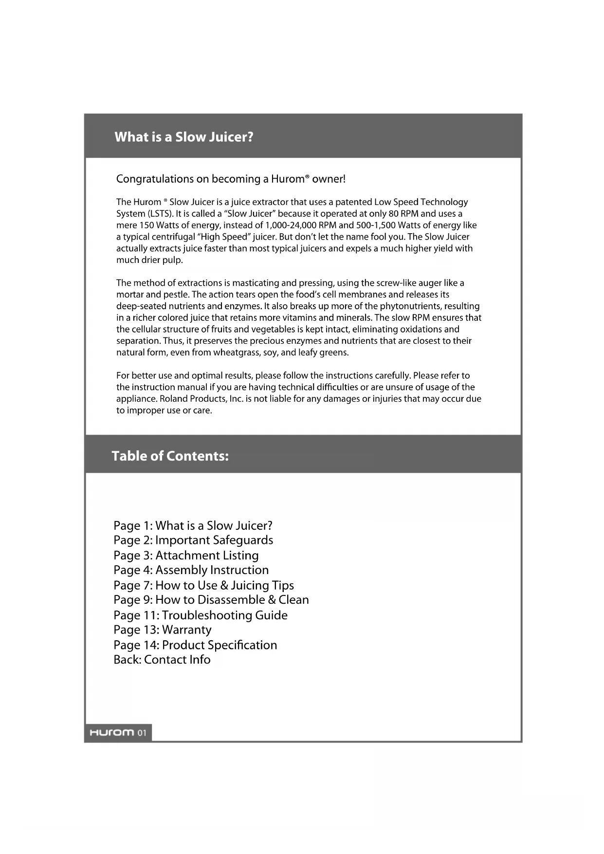For better use and optimal results, please follow the instructions carefully. Please refer to the instruction manual if you are having technical difficulties or are unsure of usage of the appliance. Roland Products, Inc. is not liable for any damages or injuries that may occur due to improper use or care.