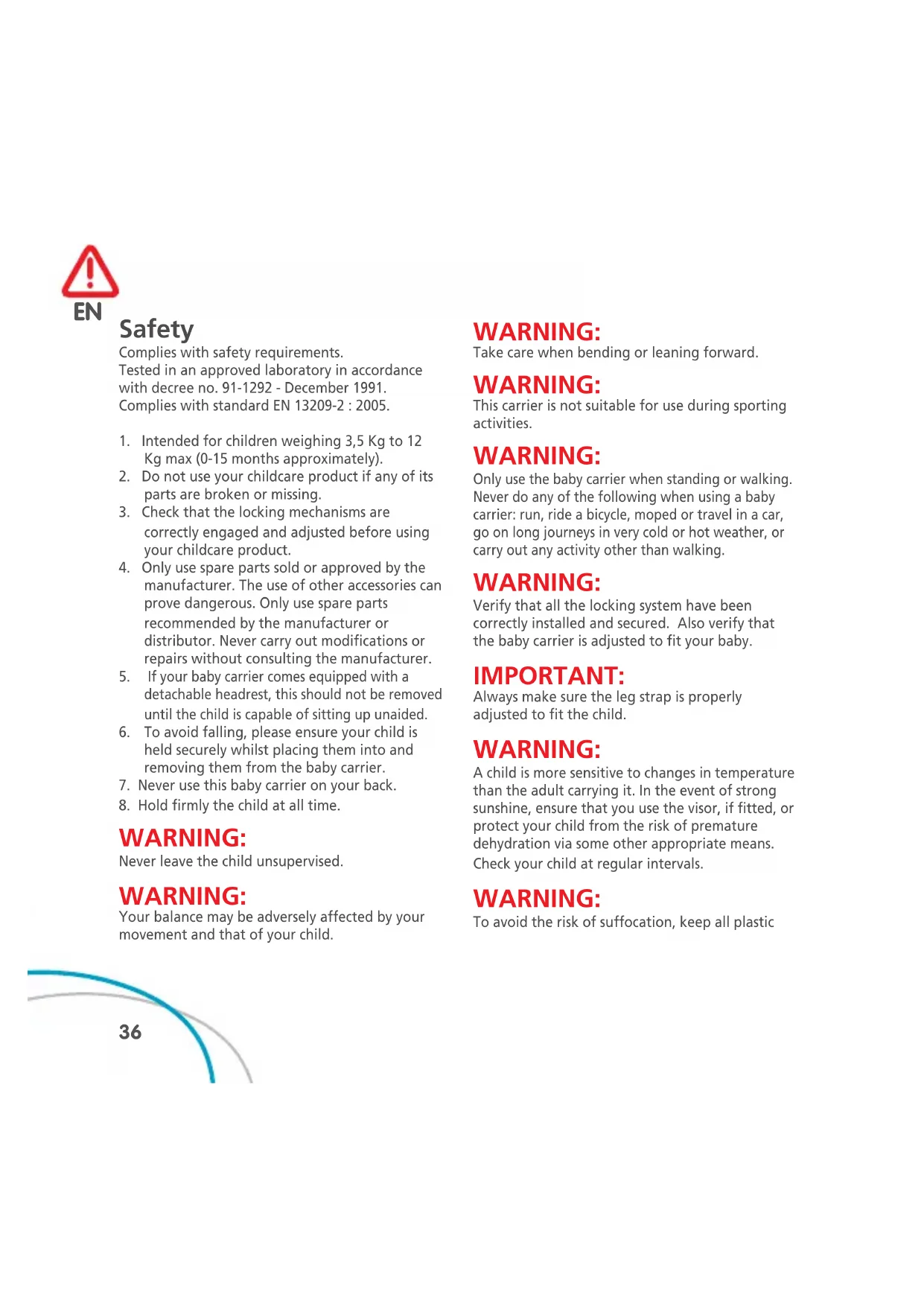 Safety Complies with safety requirements. Tested in an approved laboratory in accordance with decree no. 91-1292 - December 1991. Complies with standard EN 13209-2 : 2005. 1. Intended for children weighing 3,5 Kg to 12 Kg max (0-15 months approximately). 2. Do not use your childcare product if any of its parts are broken or missing. 3. Check that the locking mechanisms are correctly engaged and adjusted before using your childcare product. 4. Only use spare parts sold or approved by the manufacturer. The use of other accessories can prove dangerous. Only use spare parts recommended by the manufacturer or distributor. Never carry out modifications or repairs without consulting the manufacturer. If your baby carrier comes equipped with a detachable headrest, this should not be removed until the child is capable of sitting up unaided.