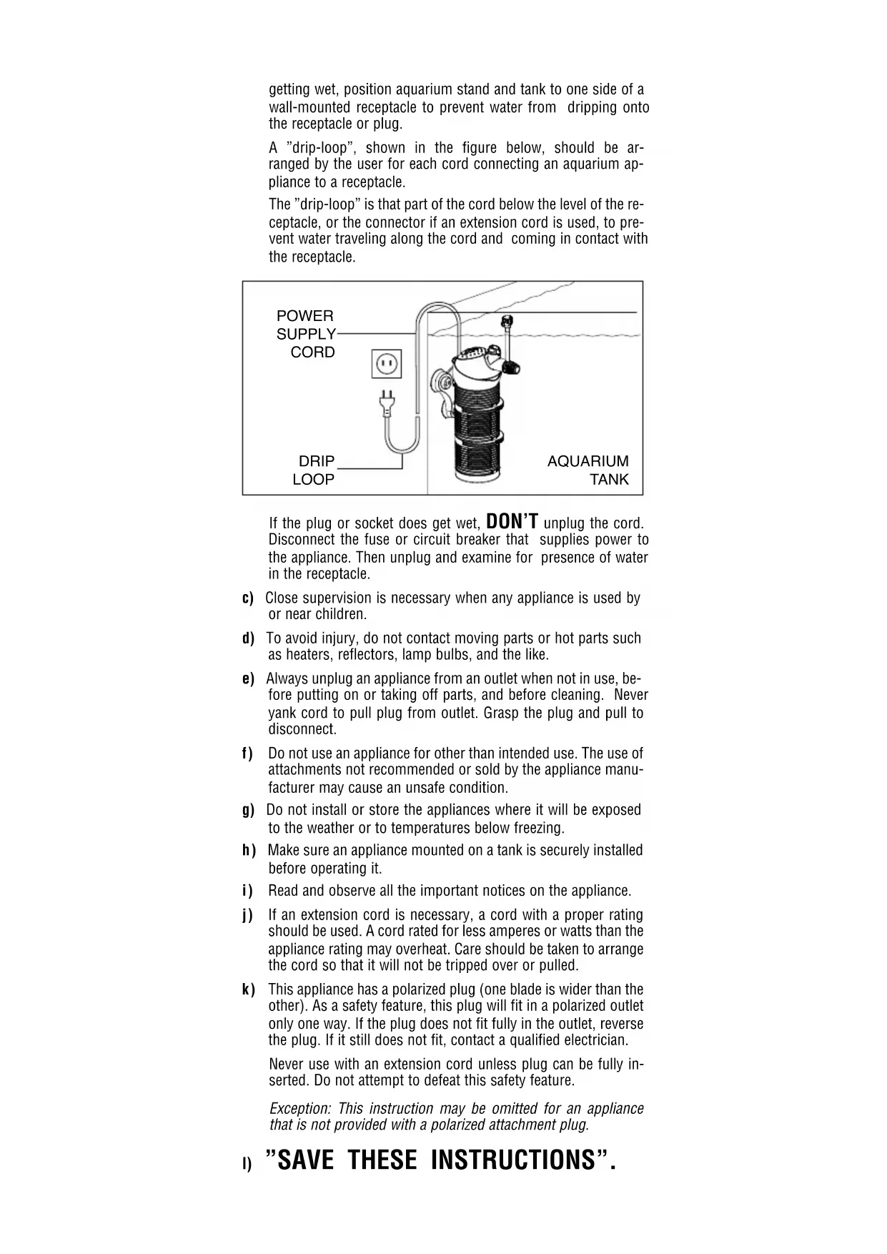 Ggetting wet, position aquarium stand and tank to one side of a wall-mounted receptacle to prevent water from dripping onto the receptacle or plug. A ”drip-loop”, shown in the figure below, should be ar- ranged by the user for each cord connecting an aquarium ap- pliance to a receptacle. The ”drip-loop” is that part of the cord below the level of the re- ceptacle, or the connector if an extension cord is used, to pre- vent water traveling along the cord and coming in contact with the receptacle. POWER SUPPLY CORD DRIP LOOP AQUARIUM TANK If the plug or socket does get wet, DON’T unplug the cord. Disconnect the fuse or circuit breaker that supplies power to the appliance. Then unplug and examine for presence of water in the receptacle. c) Close supervision is necessary when any appliance is used by or near children. d) To avoid injury, do not contact moving parts or hot parts such as heaters, reflectors, lamp bulbs, and the like. e) Always unplug an appliance from an outlet when not in use, be- fore putting on or taking off parts, and before cleaning. Never yank cord to pull plug from outlet. Grasp the plug and pull to disconnect. f) Do not use an appliance for other than intended use. The use of attachments not recommended or sold by the appliance manu- facturer may cause an unsafe condition. g) Do not install or store the appliances where it will be exposed to the weather or to temperatures below freezing. h) Make sure an appliance mounted on a tank is securely in stalled before operating it.