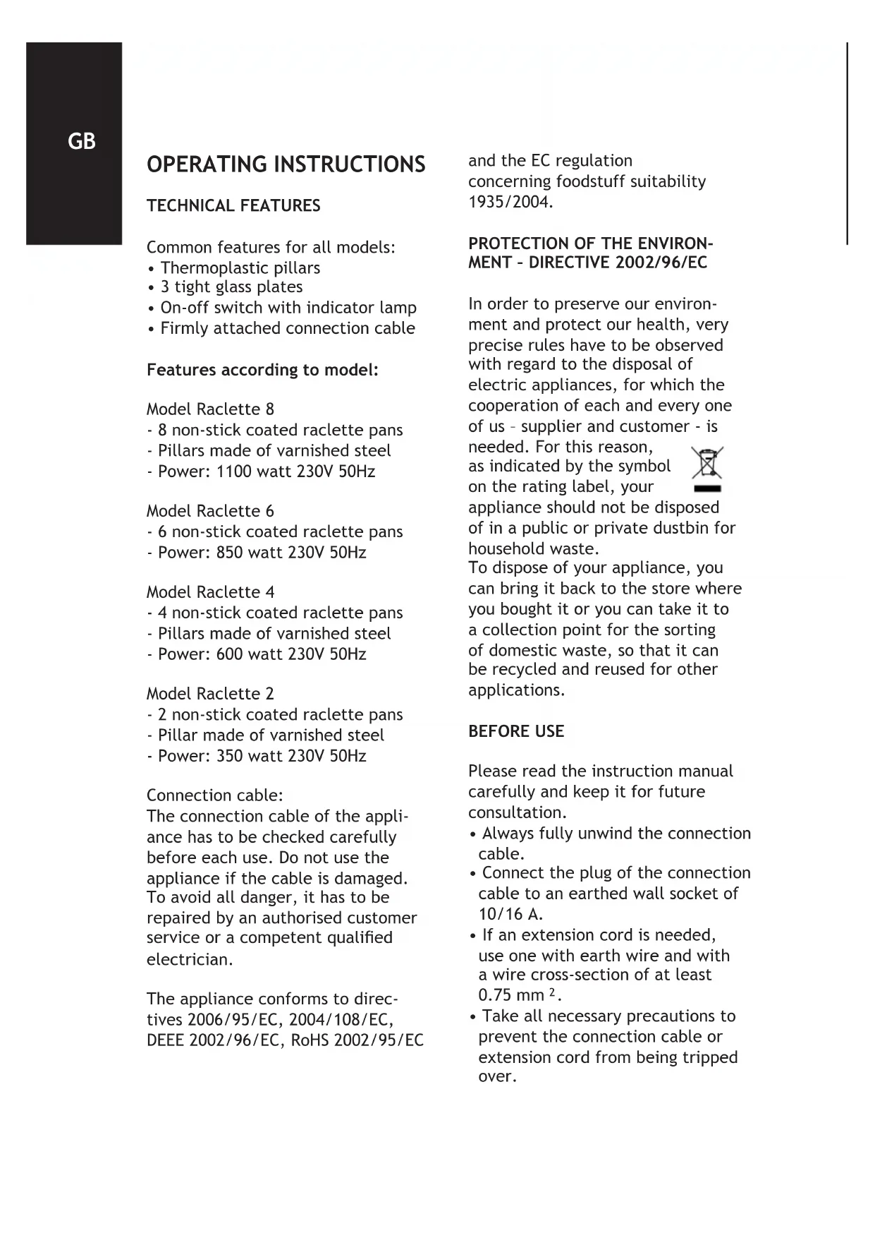 - Firmly attached connection cable Features according to model: Model Raclette 8 - 8 non-stick coated raclette pans - Pillars made of varnished steel - Power: 1100 watt 230V 50Hz Model Raclette 6 - 6 non-stick coated raclette pans - Power: 850 watt 230V 50Hz Model Raclette 4 - 4 non-stick coated raclette pans - Pillars made of varnished steel - Power: 600 watt 230V 50Hz Model Raclette 2 - 2 non-stick coated raclette pans - Pillar made of varnished steel - Power: 350 watt 230V 50Hz Connection cable: The connection cable of the appli- ance has to be checked carefully before each use. Do not use the appliance if the cable is damaged. To avoid all danger, it has to be repaired by an authorised customer serviceoracompetentqualied electrician. The appliance conforms to direc- tives 2006/95/EC, 2004/108/EC, DEEE 2002/96/EC, RoHS 2002/95/EC and the EC regulation concerning foodstuff suitability 1935/2004.
