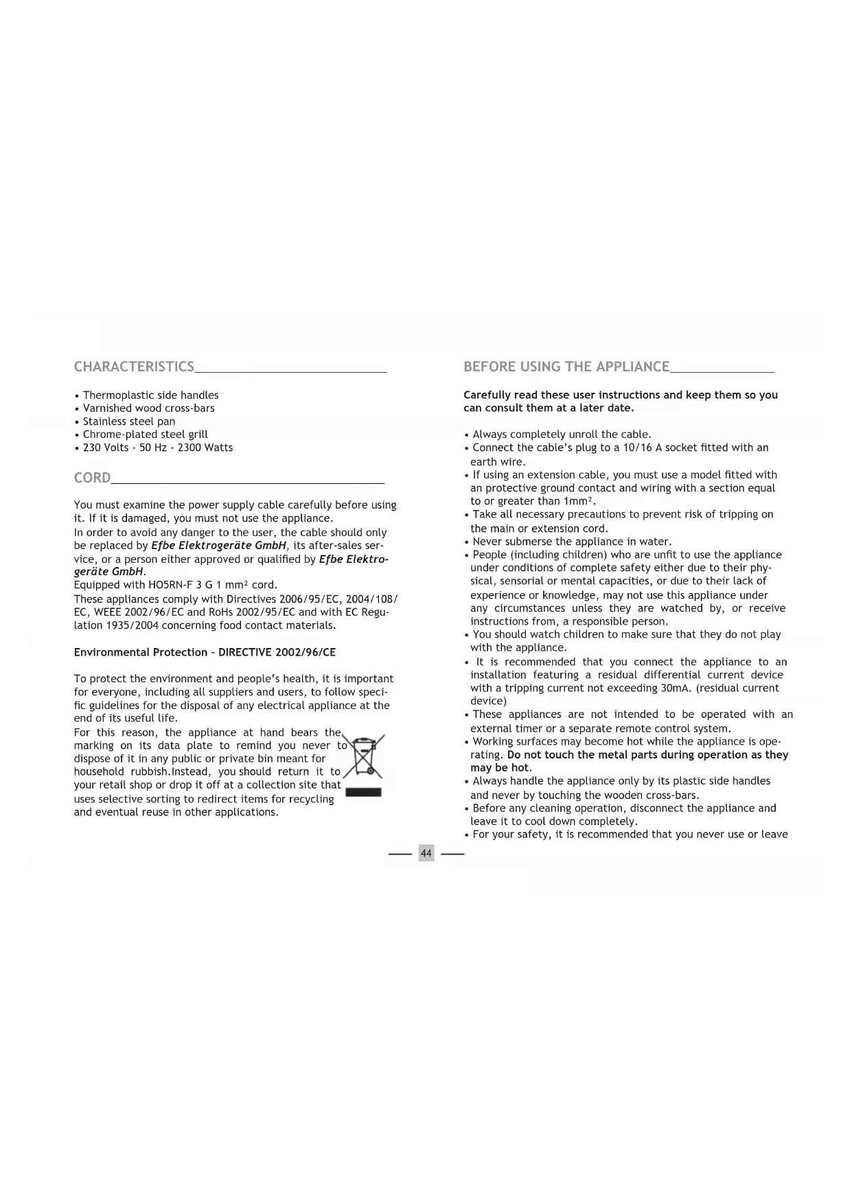 - 230 Volts - 50 Hz - 2300 Watts CORD_______________________________________________ You must examine the power supply cable carefully before using it. If it is damaged, you must not use the appliance. In order to avoid any danger to the user, the cable should only be replaced by Efbe Elektrogeräte GmbH, its after-sales ser- vice, or a person either approved or qualied by Efbe Elektro- geräte GmbH. Equipped with HO5RN-F 3 G 1 mm² cord. These appliances comply with Directives 2006/95/EC, 2004/108/ EC, WEEE 2002/96/EC and RoHs 2002/95/EC and with EC Regu- lation 1935/2004 concerning food contact materials. Environmental Protection – DIRECTIVE 2002/96/CE To protect the environment and people‘s health, it is important for everyone, including all suppliers and users, to follow speci- c guidelines for the disposal of any electrical appliance at the end of its useful life. For this reason, the appliance at hand bears the marking on its data plate to remind you never to dispose of it in any public or private bin meant for household rubbish.Instead, you should return it to your retail shop or drop it off at a collection site that uses selective sorting to redirect items for recycling and eventual reuse in other applications.