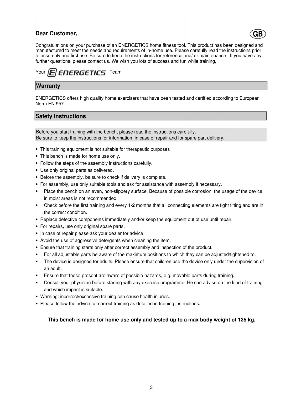 Dear Customer, Congratulations on your purchase of an ENERGETICS home fitness tool. This product has been designed and manufactured to meet the needs and requirements of in-home use. Please carefully read the instructions prior to assembly and first use. Be sure to keep the instructions for reference and/ or maintenance. If you have any further questions, please contact us. We wish you lots of success and fun while training, Your - Team Warranty ENERGETICS offers high quality home exercisers that have been tested and certified according to European Norm EN 957. Safety Instructions