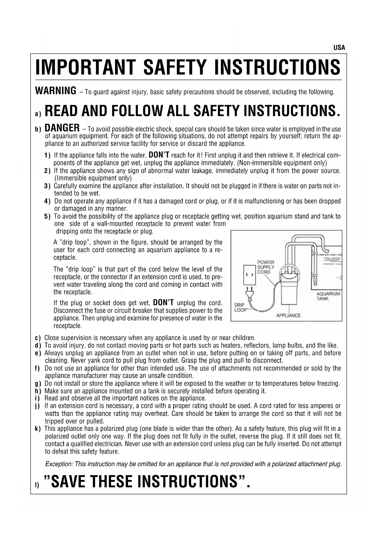 one side of a wall-mounted receptacle to prevent water from dripping onto the receptacle or plug. A ”drip loop”, shown in the figure, should be arranged by the user for each cord connecting an aquarium appliance to a re- ceptacle. The ”drip loop” is that part of the cord below the level of the receptacle, or the connector if an extension cord is used, to pre- vent water traveling along the cord and coming in contact with the receptacle. If the plug or socket does get wet, DON’T unplug the cord. Disconnect the fuse or circuit breaker that supplies power to the appliance. Then unplug and examine for presence of water in the receptacle. c) Close supervision is necessary when any appliance is used by or near children. d) To avoid injury, do not contact moving parts or hot parts such as heaters, reflectors, lamp bulbs, and the like. e) Always unplug an appliance from an outlet when not in use, before putting on or taking off parts, and before cleaning. Never yank cord to pull plug from outlet. Grasp the plug and pull to disconnect. f) Do not use an appliance for other than intended use. The use of attachments not recommended or sold by the appliance manufacturer may cause an unsafe condition. g) Do not install or store the appliance where it will be exposed to the weather or to temperatures below freezing. h) Make sure an appliance mounted on a tank is securely in stalled before operating it.