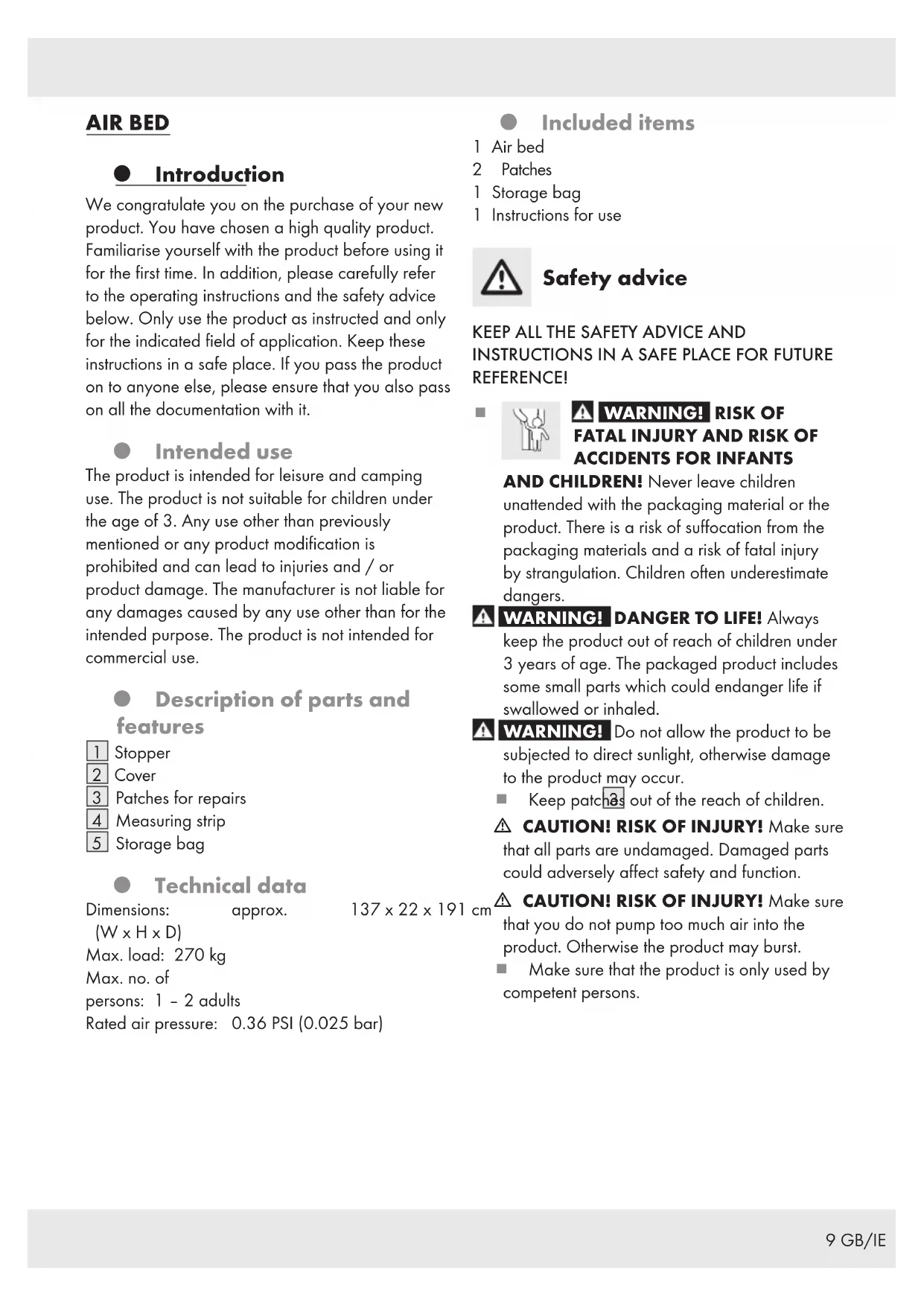 CAUTION! RISK OF INJURY! Make sure that you do not pump too much air into the product. Otherwise the product may burst.