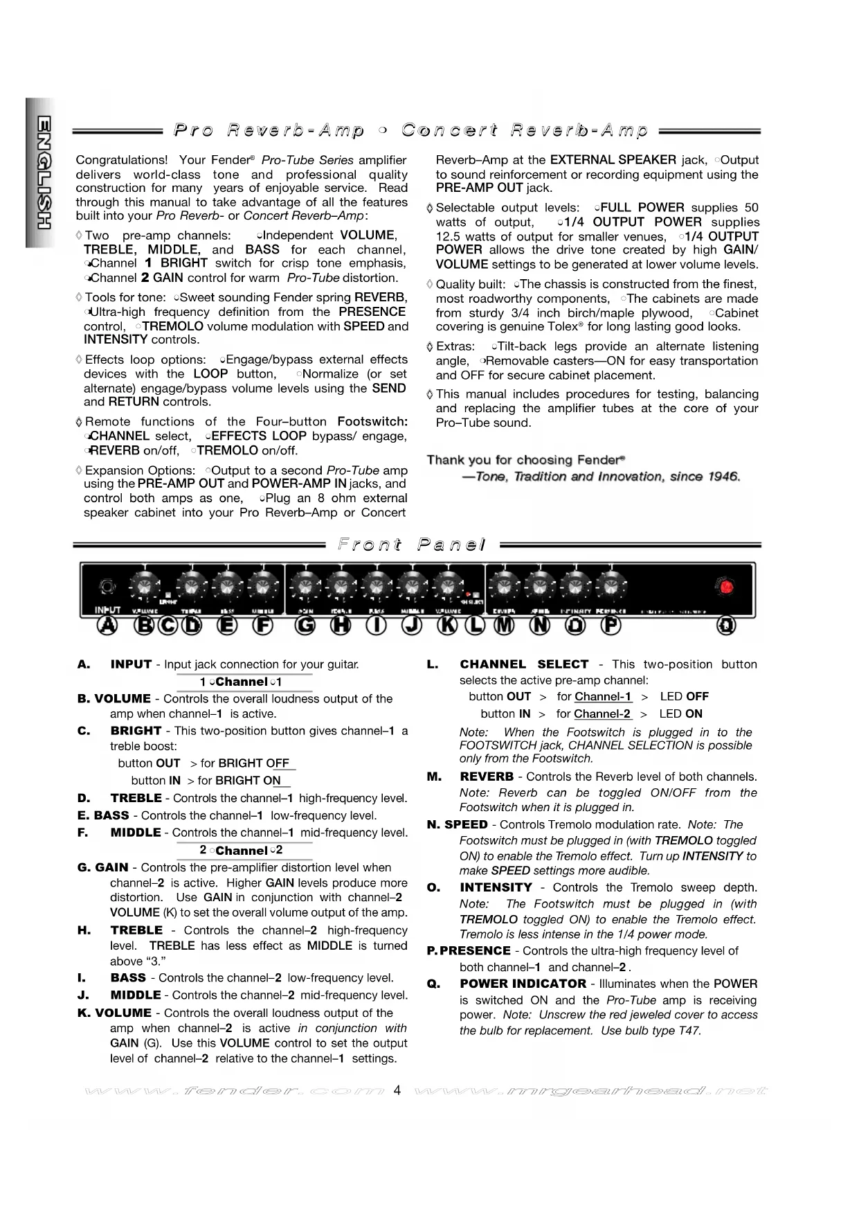 J. MIDDLE - Controls the channel–2 mid-frequency level. K. VOLUME - Controls the overall loudness output of the amp when channel–2 is active in conjunction with GAIN (G). Use this VOLUME control to set the output level of channel–2 relative to the channel–1 settings. L. CHANNEL SELECT - This two-position button selects the active pre-amp channel: button OUT > for Channel-1 > LED OFF button IN > for Channel-2 > LED ON Note: When the Footswitch is plugged in to theFOOTSWITCH jack, CHANNEL SELECTION is possibleonly from the Footswitch. M. REVERB - Controls the Reverb level of both channels. Note: Reverb can be toggled ON/OFF from the Footswitch when it is plugged in.N. SPEED - Controls Tremolo modulation rate. Note: TheFootswitch must be plugged in (with TREMOLO toggled ON) to enable the Tremolo effect. Turn up INTENSITY to make SPEED settings more audible. O. INTENSITY - Controls the Tremolo sweep depth. Note: The Footswitch must be plugged in (with TREMOLO toggled ON) to enable the Tremolo effect. Tremolo is less intense in the 1/4 power mode.P. PRESENCE - Controls the ultra-high frequency level ofboth channel–1 and channel–2. Q. POWER INDICATOR - Illuminates when the POWER is switched ON and the Pro-Tube amp is receiving power. Note: Unscrew the red jeweled cover to accessthe bulb for replacement. Use bulb type T47. Congratulations! Your Fender