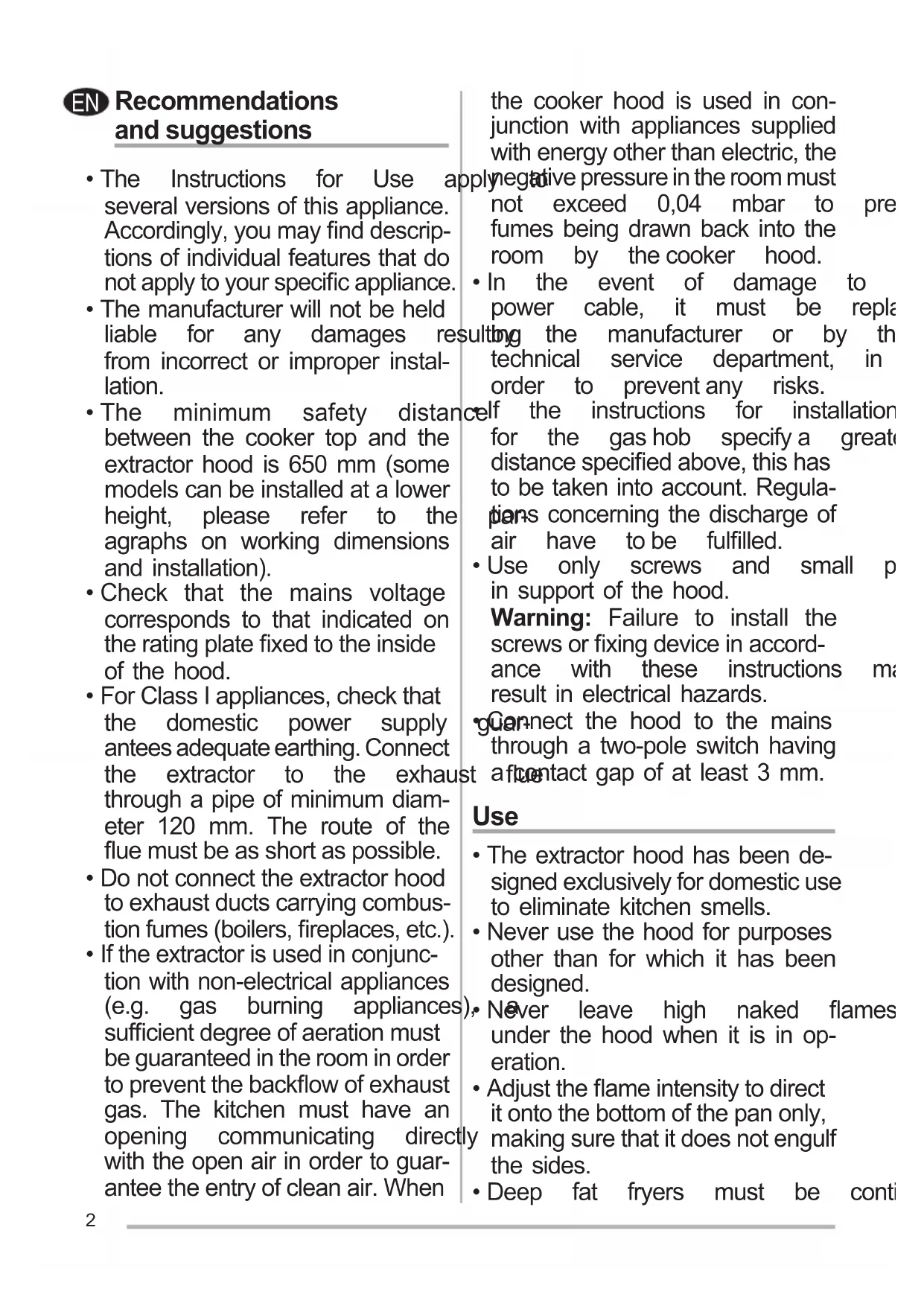- Connect the hood to the mains through a two-pole switch having a contact gap of at least 3 mm. Use