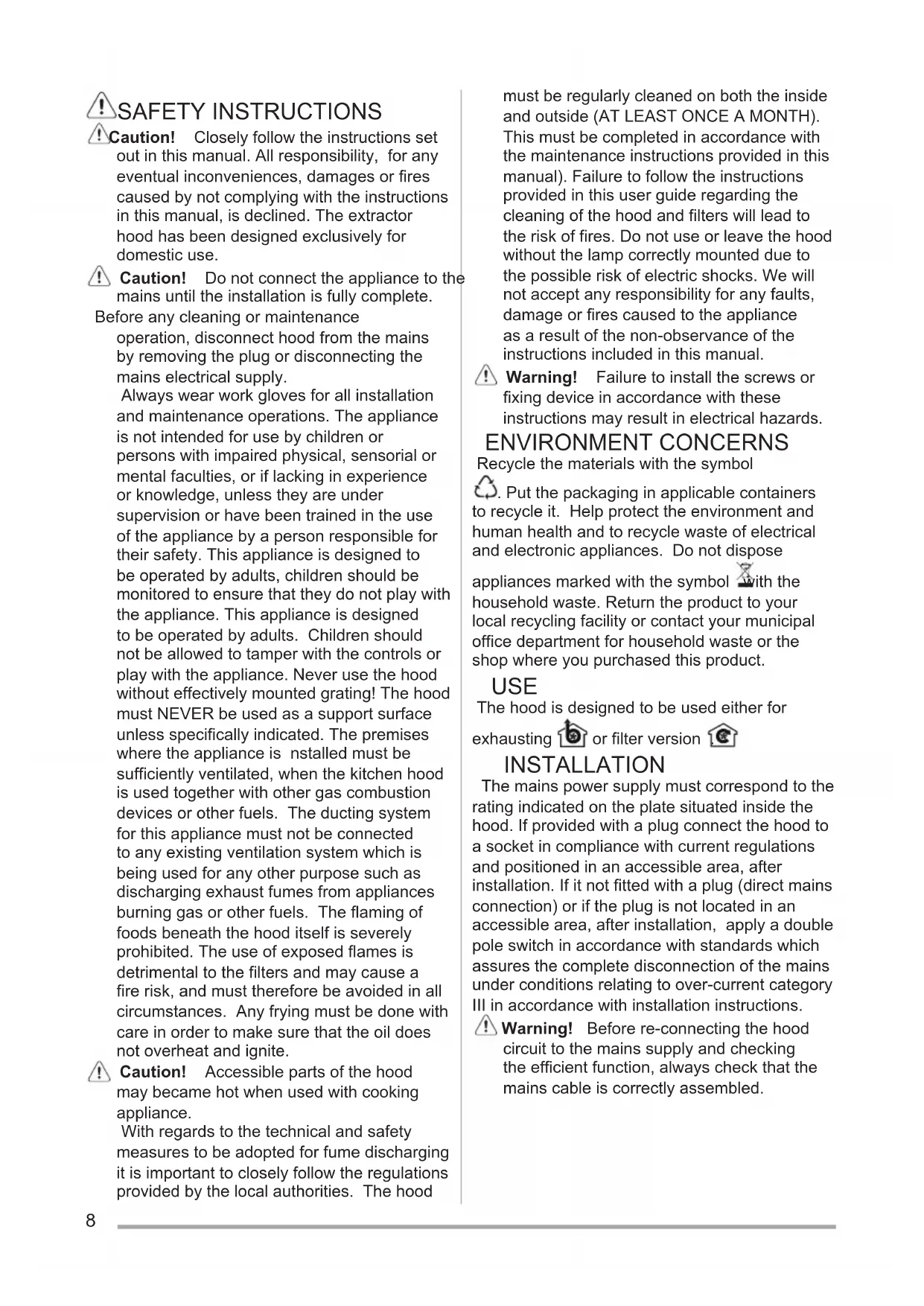 16.1-Type 208 SAFETY INSTRUCTIONS Caution! Closely follow the instructions set out in this manual. All responsibility, for any eventual inconveniences, damages or fires caused by not complying with the instructions in this manual, is declined. The extractor hood has been designed exclusively for domestic use. Caution! Do not connect the appliance to the mains until the installation is fully complete. Before any cleaning or maintenance operation, disconnect hood from the mains by removing the plug or disconnecting the mains electrical supply. Always wear work gloves for all installation and maintenance operations. The appliance is not intended for use by children or persons with impaired physical, sensorial or mental faculties, or if lacking in experience or knowledge, unless they are under supervision or have been trained in the use of the appliance by a person responsible for their safety. This appliance is designed to be operated by adults, children should be monitored to ensure that they do not play with the appliance. This appliance is designed to be operated by adults. Children should not be allowed to tamper with the controls or play with the appliance. Never use the hood without effectively mounted grating! The hood must NEVER be used as a support surface unless specifically indicated. The premises where the appliance is nstalled must be sufficiently ventilated, when the kitchen hood is used together with other gas combustion devices or other fuels. The ducting system for this appliance must not be connected to any existing ventilation system which is being used for any other purpose such as discharging exhaust fumes from appliances burning gas or other fuels. The flaming of foods beneath the hood itself is severely prohibited. The use of exposed flames is detrimental to the filters and may cause a fire risk, and must therefore be avoided in all circumstances. Any frying must be done with care in order to make sure that the oil does not overheat and ignite. Caution! Accessible parts of the hood may became hot when used with cooking appliance. With regards to the technical and safety measures to be adopted for fume discharging it is important to closely follow the regulations provided by the local authorities. The hood must be regularly cleaned on both the inside and outside (AT LEAST ONCE A MONTH). This must be completed in accordance with the maintenance instructions provided in this manual). Failure to follow the instructions provided in this user guide regarding the cleaning of the hood and filters will lead to the risk of fires. Do not use or leave the hood without the lamp correctly mounted due to the possible risk of electric shocks. We will not accept any responsibility for any faults, damage or fires caused to the appliance as a result of the non-observance of the instructions included in this manual. Warning! Failure to install the screws or fixing device in accordance with these instructions may result in electrical hazards. ENVIRONMENT CONCERNS Recycle the materials with the symbol . Put the packaging in applicable containers to recycle it. Help protect the environment and human health and to recycle waste of electrical and electronic appliances. Do not dispose appliances marked with the symbol with the household waste. Return the product to your local recycling facility or contact your municipal office department for household waste or the shop where you purchased this product. USE The hood is designed to be used either for exhausting or filter version . INSTALLATION The mains power supply must correspond to the rating indicated on the plate situated inside the hood. If provided with a plug connect the hood to a socket in compliance with current regulations and positioned in an accessible area, after installation. If it not fitted with a plug (direct mains connection) or if the plug is not located in an accessible area, after installation, apply a double pole switch in accordance with standards which assures the complete disconnection of the mains under conditions relating to over-current category III in accordance with installation instructions. Warning! Before re-connecting the hood circuit to the mains supply and checking the efficient function, always check that the mains cable is correctly assembled.9 The minimum distance between the supporting surface for the cooking equipment on the hob and the lowest part of the range hood must be not less than 50cm from electric cookers and 65cm from gas or mixed cookers. If the instructions for installation for the gas hob specify a greater distance, this must be adhered to. MAINTENANCE ATTENTION! Before performing any maintenance operation, isolate the hood from the electrical supply by switching off at the connector and removing the connector fuse. Or if the appliance has been connected through a plug and socket, then the plug must be removed from the socket. The cooker hood should be cleaned regularly (at least with the same frequency with which you carry out maintenance of the fat filters) internally and externally. Clean using the cloth dampened with neutral liquid detergent. Do not use abrasive products. DO NOT USE ALCOHOL! Warning! Failure to carry out the basic cleaning recommendations of the cooker hood and replacement of the filters may cause fire risks. Therefore, we recommend observing these instructions. The manufacturer declines all responsibility for any damage to the motor or any fire damage linked to inappropriate maintenance or failure to observe the above safety recommendations. Grease filter - The grease filter must be cleaned once a month using non aggressive detergents, either by hand or in the dishwasher, which must be set to a low temperature and a short cycle. When washed in a dishwasher, the grease filter may discolour slightly, but this does not affect its filtering capacity. Charcoal filter - Type 20 LONG LIFE - Wash- able activated charcoal filter The charcoal filter can be washed once every two m