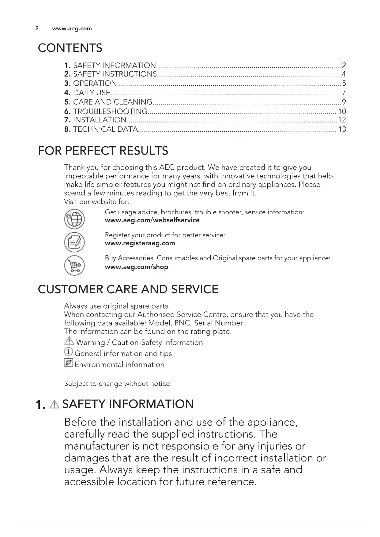 Thank you for choosing this AEG product. We have created it to give you impeccable performance for many years, with innovative technologies that help make life simpler features you might not find on ordinary appliances. Please spend a few minutes reading to get the very best from it. Visit our website for: Get usage advice, brochures, trouble shooter, service information: www.aeg.com/webselfservice Register your product for better service: www.registeraeg.com Buy Accessories, Consumables and Original spare parts for your appliance: www.aeg.com/shop