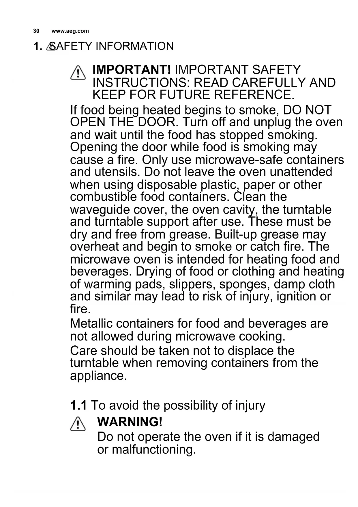 We recommend the use of original spare parts. When contacting Service, ensure that you have the following data available. The information can be found on the rating plate. Model, PNC, Serial Number. Subject to change without notice. Warning/Caution-Safety information General information and tips Environmental information Get usage advice, brochures, trouble shooter, service information: www.aeg.com Register your product for better service: www.registeraeg.com Buy Accessories, Consumables and Original spare parts for your appliance: www.aeg.com/shop 1. SAFETY INFORMATION..................................................................................................30
