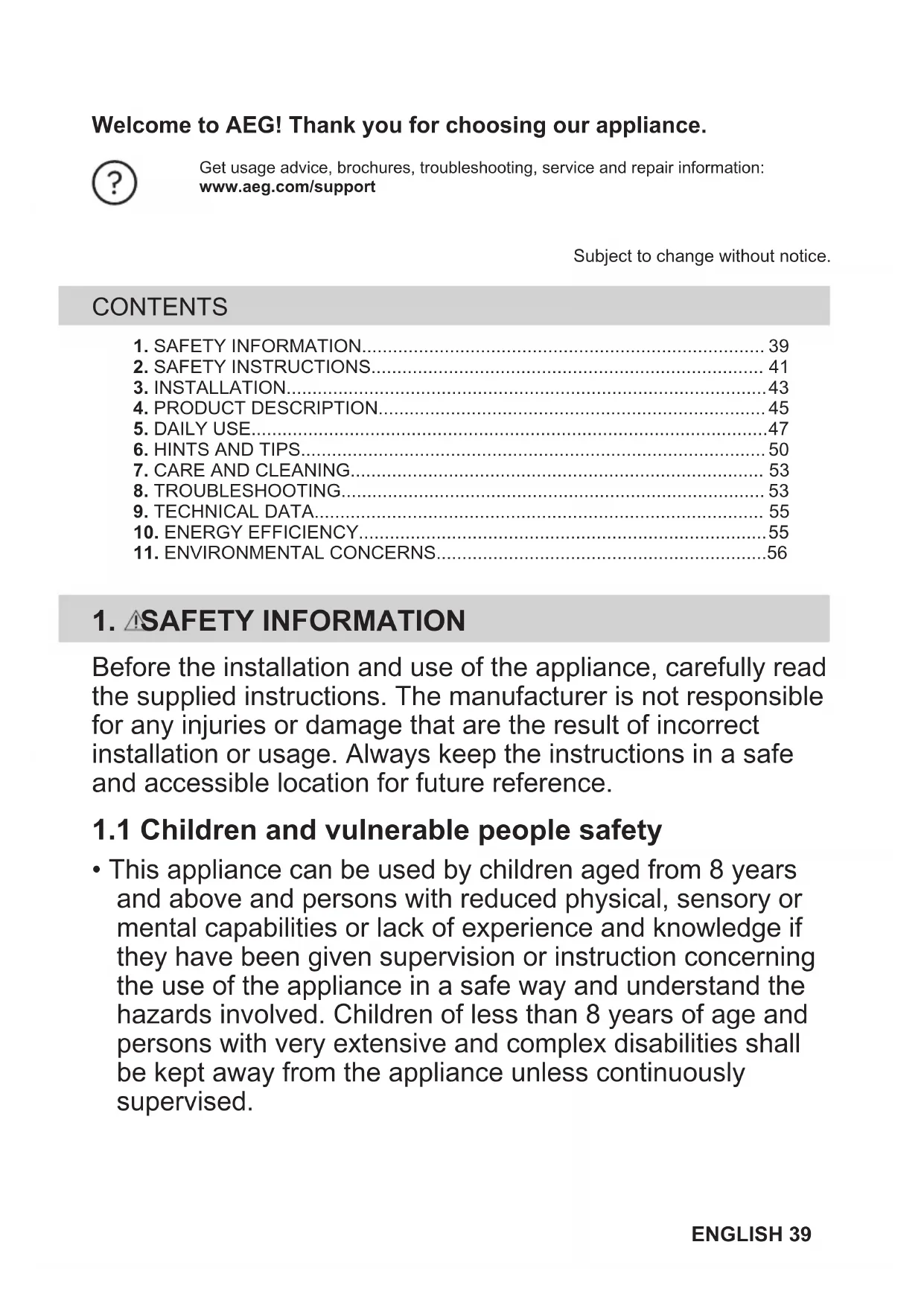 - This appliance can be used by children aged from 8 years and above and persons with reduced physical, sensory or mental capabilities or lack of experience and knowledge if they have been given supervision or instruction concerning the use of the appliance in a safe way and understand the hazards involved. Children of less than 8 years of age and persons with very extensive and complex disabilities shall be kept away from the appliance unless continuously supervised. ENGLISH 39• Children should be supervised to ensure that they do not play with the appliance.