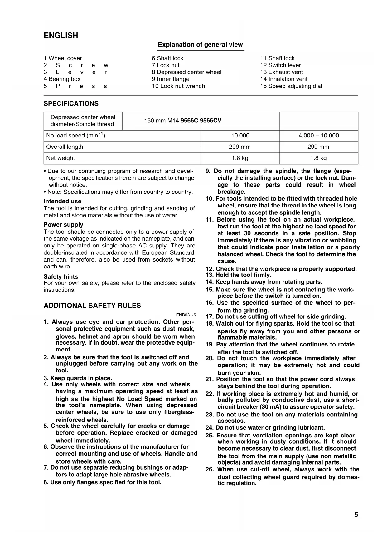 eral pressure. SAVE THESE INSTRUCTIONS. OPERATING INSTRUCTIONS Installing wheel guard (Fig. 1 & 2) Important: Always be sure that the tool is switched off and unplugged before installing or removing the wheel guard. Pull the lever in the direction of the arrow after loosening the screw. Install the wheel cover on the bearing box by adjusting the convex of the wheel cover to the concave of the bear- ing box. Turn the wheel cover by 180 degrees. Fasten it with the screw after pulling lever in the direction of the arrow for the working purpose, the setting angle of the wheel cover can be adjusted with the lever. Removing wheel cover Follow the installation procedure in reverse to remove the wheel cover. Installing side grip (auxiliary handle) (Fig. 3) Important: Always be sure that the tool is switched off and unplugged before installing or removing the side grip. Always install the side grip on the tool securely before operation. The side grip can be installed on either side of the tool, whichever is convenient and keeps the guard properly positioned. Always hold the tool’s switch handle and the side grip firmly with both hands during operation. Shaft lock (Fig. 4) Press the shaft lock to prevent spindle rotation when installing or removing accessories. CAUTION: Never actuate the shaft lock when the spindle is moving. The tool may be damaged. Installing or removing depressed center wheel (Fig. 5 & 6) Important: Always be sure that the tool is switched off and unplugged before installing or removing the wheel. Mount the inner flange onto the spindle. Fit the wheel on over the inner flange and screw the lock nut onto the spindle. To tighten the lock nut, press the shaft lock firmly so that the spindle cannot revolve, then use the lock nut wrench and securely tighten clockwise. To remove the wheel, fol- low the installation procedure in reverse. Switch action (Fig. 7) CAUTION: Before plugging in the tool, always check to see that the switch actuates properly and returns to the ‘‘O(OFF)’’ position when the rear of the switch lever is depressed. To start the tool, slide the switch lever toward the ‘‘I (ON)’’ position. For continuous operation, press the front of the switch lever to lock it. To stop the tool, press the rear of the switch lever, then slide it toward the ‘‘O(OFF)’’ posi- tion. Speed adjusting dial (For model 9566CV) (Fig. 8) The rotating speed can be changed by turning the speed adjusting dial to a given number setting from 1 to 5. Higher speed is obtained when the dial is turned in the direction of number 5. And lower speed is obtained when it is turned in the direction of number 1. Refer to the table below for the relationship between the number settings on the dial and the approximate rotating speed. CAUTION: