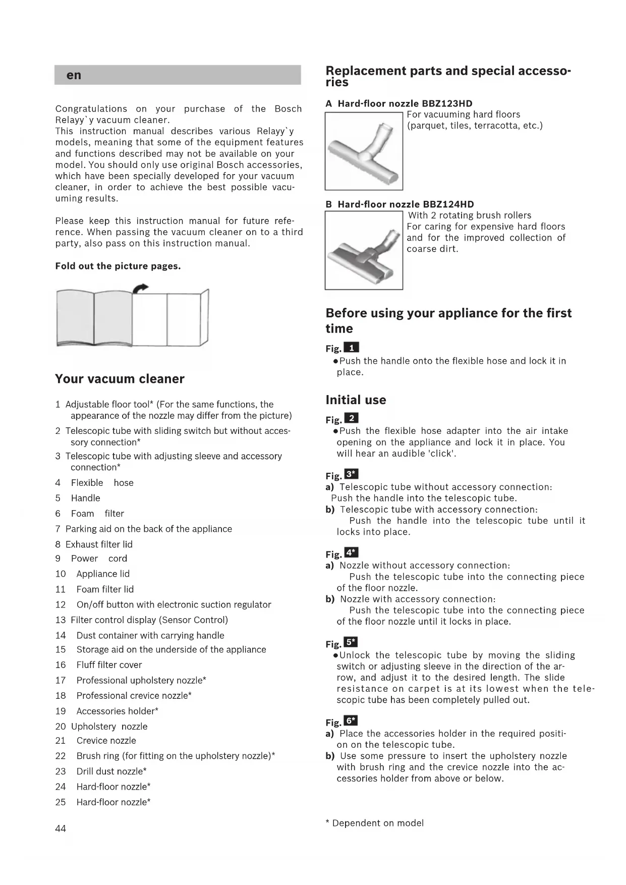 Congratulations on your purchase of the Bosch Relayy`y vacuum cleaner. This instruction manual describes various Relayy`y models, meaning that some of the equipment features and functions described may not be available on your model. You should only use original Bosch accessories, which have been specially developed for your vacuum cleaner, in order to achieve the best possible vacu- uming results. Please keep this instruction manual for future refe- rence. When passing the vacuum cleaner on to a third party, also pass on this instruction manual. Fold out the picture pages. Your vacuum cleaner 1 Adjustable floor tool* (For the same functions, the appearance of the nozzle may differ from the picture) 2 Telescopic tube with sliding switch but without acces- sory connection* 3 Telescopic tube with adjusting sleeve and accessory connection* 4 Flexible hose 5 Handle 6 Foam filter 7 Parking aid on the back of the appliance 8 Exhaust filter lid 9 Power cord 10 Appliance lid 11 Foam filter lid 12 On/off button with electronic suction regulator 13 Filter control display (Sensor Control) 14 Dust container with carrying handle 15 Storage aid on the underside of the appliance 16 Fluff filter cover 17 Professional upholstery nozzle* 18 Professional crevice nozzle* 19 Accessories holder* 20 Upholstery nozzle 21 Crevice nozzle 22 Brush ring (for fitting on the upholstery nozzle)* 23 Drill dust nozzle* 24 Hard-floor nozzle* 25 Hard-floor nozzle*