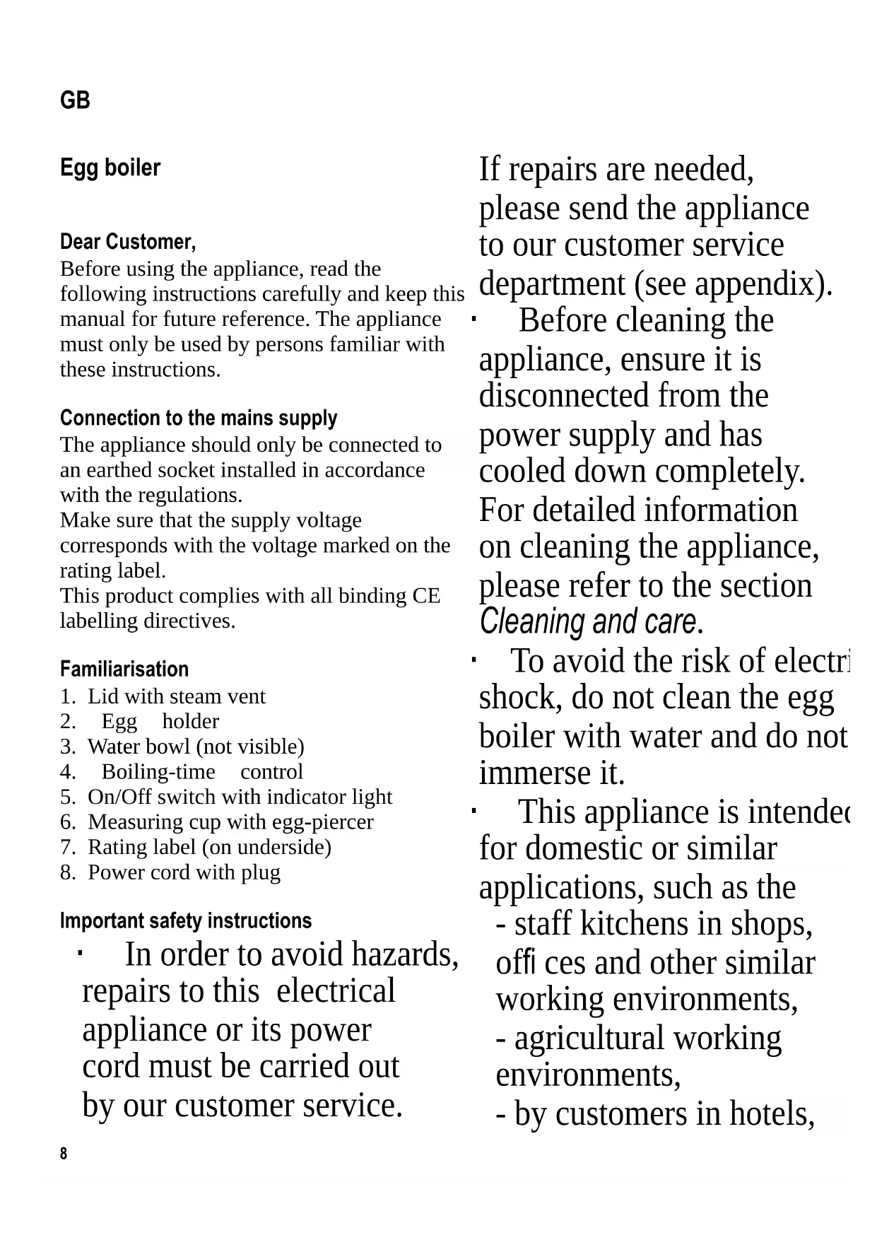 Important safety instructions ∙ In order to avoid hazards, repairs to this electrical appliance or its power cord must be carried out by our customer service. If repairs are needed, please send the appliance to our customer service department (see appendix). ∙ Before cleaning the appliance, ensure it is disconnected from the power supply and has cooled down completely. For detailed information on cleaning the appliance, please refer to the section Cleaning and care. ∙ To avoid the risk of electric shock, do not clean the egg boiler with water and do not immerse it. ∙ This appliance is intended for domestic or similar applications, such as the - staff kitchens in shops, offi ces and other similar working environments, - agricultural working environments, - by customers in hotels, GB9 motels etc. and similar accommodation, - in bed-and breakfast type environments. ∙ Be careful when using the egg-piercer, as there may be a risk of injury. ∙ The exterior surfaces and the water bowl become hot during use and will remain so for some time afterwards. Grip the hot appliance only by its handle. ∙ Caution: Hot steam may be emitted from the lid. ∙ Caution: Any misuse can cause severe personal injury. ∙ This appliance may be used by children (at least 8 years of age) and by persons with reduced physical, sensory or mental capabilities, or lacking experience and knowledge, provided they have been given supervision or instruction concerning the use of the appliance and fully understand all dangers and safety precautions involved. ∙ Children must not be permitted to play with the appliance. ∙ Children must not be permitted to carry out any cleaning or maintenance work on the appliance unless they are supervised and at least 8 years of age. ∙ The appliance and its power cord must be kept well away from children under 8 at all times. ∙ Caution: Keep any packaging materials well away from children – such materials are a potential source of danger, e.g. of suffocation. ∙ Every time the appliance is used, the main body including the power cord as well as any attachment fi tted should be checked thoroughly for any defects. Should the appliance, for instance, have been dropped onto a hard surface, or if excessive force has been used to pull the power cord, it must no longer be used:10 even invisible damage may have adverse effects on the operational safety of the appliance. In this case, please contact our customer service. ∙ Do not leave the appliance unattended while in use. ∙ Keep the power cord away from any hot part of the appliance. Do not wind the cord around the appliance until it has completely cooled down. ∙ Always remove the plug from the wall socket - in case of any malfunction, - after use, and also - before cleaning the appliance. ∙ When removing the plug from the wall socket, never pull on the power cord; always grip the plug itself. ∙ During operation, the appliance must be placed on a level surface, resistant to heat and water. ∙ Do not position the appliance on or near hot surfaces or open fl ames such as hot- plates or gas fl ames. Do not operate the appliance underneath sensitive objects or furniture such as wall-cupboards, as hot steam is emitted from the lid during use. ∙ No responsibility will be accepted if damage results from improper use, or if these instructions are not complied with. Before using for the fi rst time Clean the water bowl, the egg holder and lid with a damp cloth. How to use your egg boiler ∙ Fill the measuring cup completely with cold water and pour the measured quantity into the water bowl. ∙ Pierce the blunt end of each egg with the piercer; this will reduce the risk of the eggs cracking during boiling. ∙ Place the eggs into the holder, fi t the holder onto the water bowl and put the lid on. ∙ Use the boiling-time control to select the desired degree of hardness: – soft – medium – hard ∙ The markings refer to medium-size eggs. However, it is possible to adjust the degree of hardness infi nitely, depending on the number and size of eggs to be boiled. ∙ Insert the plug into a suitable wall socket and use the On/Off switch to turn the egg boiler on. The indicator light comes on. ∙ A beep is heard once the pre-set cooking time for the desired hardness of the eggs has elapsed. ∙ Switch off the appliance. The indicator light goes out. Remove the plug from the wall socket. ∙ Open the lid. Caution: When the lid is opened, hot steam will escape. ∙ Remove the egg holder with the eggs from the bowl and place it immediately under cold running water. Note: if the eggs are not removed from the boiler without delay, they will continue to harden.11 Cleaning and care ∙ Always remove the plug from the wall socket, allow the appliance to cool down and pour out any remaining water before cleaning. ∙ To avoid the risk of electric shock, do not clean the appliance with water and do not immerse it in water. ∙ In order to prevent the polished surfaces from being damaged or scratched, do not use abrasives or harsh cleaning solutions. ∙ Wipe the water bowl with a damp cloth only. ∙ Any build-up of deposits on the water bowl can be removed using a solution of water and vinegar. Then let the appliance run through one boiling cycle using fresh cold water to clean it of any vinegar residue. ∙ Thoroughly rinse the egg holder and wipe dry afterwards. ∙ The lid may be wiped clean with a damp cloth. Disposal Devices marked with this symbol must be disposed of separately from your household waste, as they contain valuable materials which can be recycled. Proper disposal protects the environment and human health. Your local authority or retailer can provide information on the matter. Guarantee This product is guaranteed against defects in materials and workmanship for a period of two years from the date of purchase. Under this guarantee the manufacturer undertakes to repair or replace any parts found to be defective,