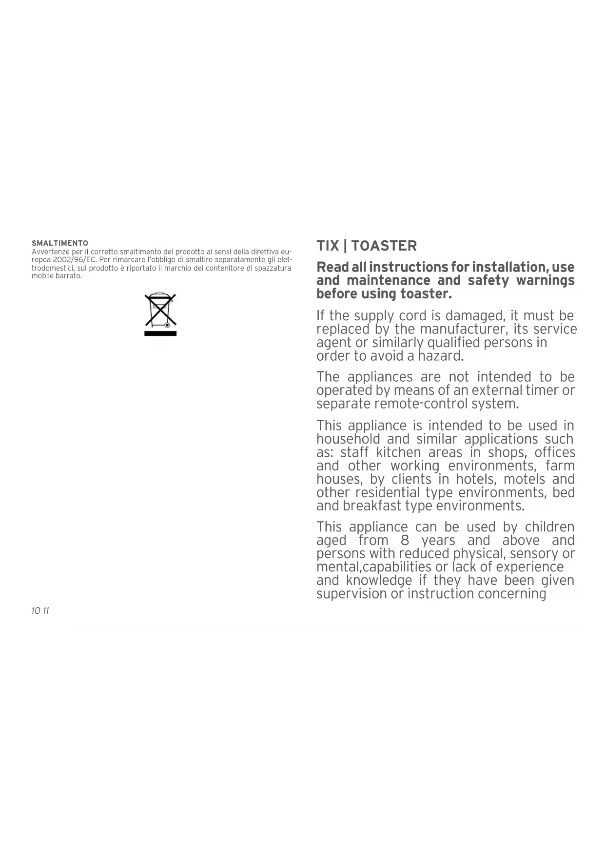 Read all instructions for installation, use and maintenance and safety warnings before using toaster.