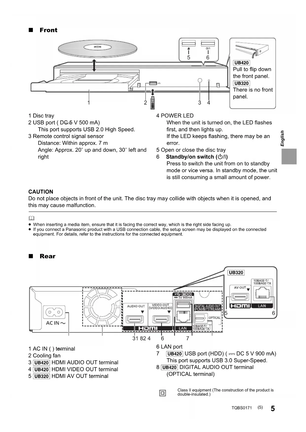 1 Turn the unit on and off 2 TV operation buttons You can operate the Panasonic TV using this unit’s remote control. Some buttons may not work depending on the TV. 3 Select title numbers, etc./Enter numbers or characters 4 Cancel Clear the currently selected character. (when entering a password for “Ratings” in the Setup menu, for example) 5 Change soundtrack 6 Basic playback control buttons 7 Show Pop-up menu 8 Show Top menu 9 Show Option menu 10 Coloured buttons (red, green, yellow, blue) Used for various purposes depending on the screen 11 Transmit the remote control signal 12 Open or close the disc tray 13 Show the status messages 14 Show “Playback Information Window” 15 Show the Home screen of the Network Service 16 Show “HDR Setting” 17 Show NETFLIX screen 18 Show HOME menu 19 [3, 4, 2, 1] : Move the highlight for selection [OK] : Confirm the selection (2;)(;1) : Frame-by-frame 20 Return to previous screen (4) DP-UB420-320-EG-TQBS0171_eng.book 4 ページ 2018年2月23日 金曜日 午後5時5分English TQBS0171 ∫ Front 1 Disc tray 2 USB port ( DC 5 V 500 mA) This port supports USB 2.0 High Speed. 3 Remote control signal sensor Distance: Within approx. 7 m Angle: Approx. 20e up and down, 30e left and right 4 POWER LED When the unit is turned on, the LED flashes first, and then lights up. If the LED keeps flashing, there may be an error. 5 Open or close the disc tray 6 Standby/on switch (Í/I) Press to switch the unit from on to standby mode or vice versa. In standby mode, the unit is still consuming a small amount of power. ∫ Rear 1 AC IN ( ) terminal 2 Cooling fan 3 [UB420] HDMI AUDIO OUT terminal 4 [UB420] HDMI VIDEO OUT terminal 5 [UB320] HDMI AV OUT terminal 6 LAN port 7 [UB420] USB port (HDD) ( DC 5 V 900 mA) This port supports USB 3.0 Super-Speed. 8 [UB420] DIGITAL AUDIO OUT terminal (OPTICAL terminal)