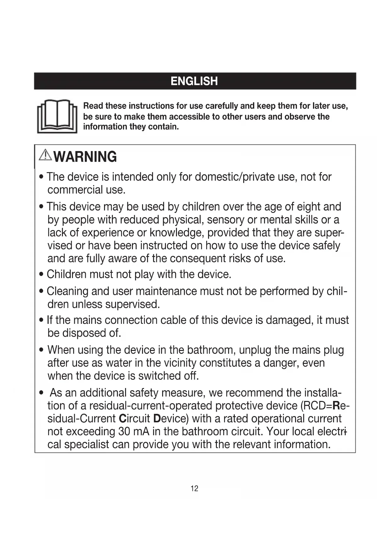 - As an additional safety measure, we recommend the installa- tion of a residual-current-operated protective device (RCD=Re- sidual-Current Circuit Device) with a rated operational current not exceeding 30 mA in the bathroom circuit. Your local electri