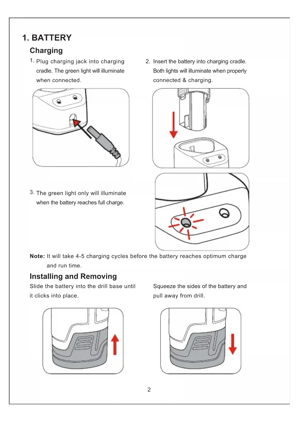 Installing and Removing Slide the battery into the drill base until it clicks into place. Plug charging jack into charging cradle. The green light will illuminate when connected. The green light only will illuminate when the battery reaches full charge. Insert the battery into charging cradle. Both lights will illuminate when properly connected & charging. Squeeze the sides of the battery and pull away from drill. Note: It will take 4-5 charging cycles before the battery reaches optimum charge and run time.