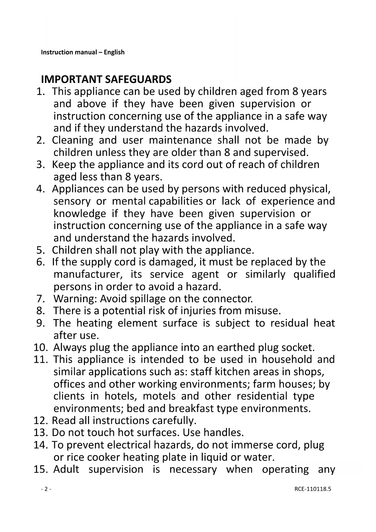 RCE110118 - Rice cooker Emerio - Free user manual and instructions