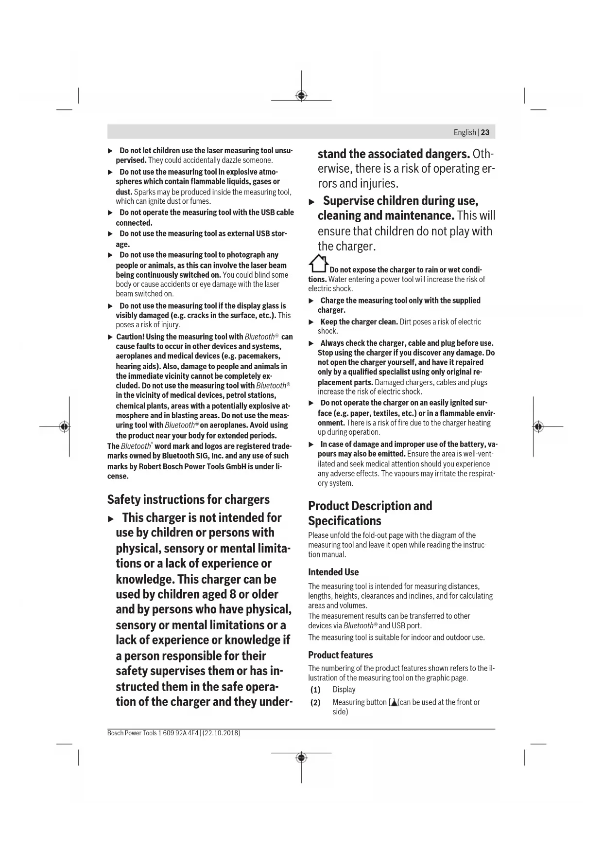 word mark and logos are registered trade- marks owned by Bluetooth SIG, Inc. and any use of such marks by Robert Bosch Power Tools GmbH is under li- cense. Safety instructions for chargers u This charger is not intended for use by children or persons with physical, sensory or mental limita- tions or a lack of experience or knowledge. This charger can be used by children aged 8 or older and by persons who have physical, sensory or mental limitations or a lack of experience or knowledge if a person responsible for their safety supervises them or has in- structed them in the safe opera- tion of the charger and they under- stand the associated dangers. Oth- erwise, there is a risk of operating er- rors and injuries. u Supervise children during use, cleaning and maintenance. This will ensure that children do not play with the charger. Do not expose the charger to rain or wet condi- tions. Water entering a power tool will increase the risk of electric shock. u Charge the measuring tool only with the supplied charger. u Keep the charger clean. Dirt poses a risk of electric shock. u Always check the charger, cable and plug before use. Stop using the charger if you discover any damage. Do not open the charger yourself, and have it repaired only by a qualified specialist using only original re- placement parts. Damaged chargers, cables and plugs increase the risk of electric shock. u Do not operate the charger on an easily ignited sur- face (e.g. paper, textiles, etc.) or in a flammable envir- onment. There is a risk of fire due to the charger heating up during operation. u In case of damage and improper use of the battery, va- pours may also be emitted. Ensure the area is well-vent- ilated and seek medical attention should you experience any adverse effects. The vapours may irritate the respirat- ory system. Product Description and Specifications Please unfold the fold-out page with the diagram of the measuring tool and leave it open while reading the instruc- tion manual. Intended Use The measuring tool is intended for measuring distances, lengths, heights, clearances and inclines, and for calculating areas and volumes. The measurement results can be transferred to other devices via Bluetooth® and USB port. The measuring tool is suitable for indoor and outdoor use. Product features The numbering of the product features shown refers to the il- lustration of the measuring tool on the graphic page. (1) Display (2) Measuring button [ ] (can be used at the front or side) English | 23 Bosch Power Tools 1 609 92A 4F4 | (22.10.2018)24 | English 1 609 92A 4F4 | (22.10.2018) Bosch Power Tools (3) Soft key [ ] (4) Plus button [+] / Select to the right (5) Zoom button (6) Carrying strap lug (7) Measuring pin release button (8) Measuring pin (9) On/off/delete button [ ] (10) Camera button (11) Minus button [–] / Select to the left (12) Soft key [ ] (13) Function button [Func] (14) Laser warning label (15) Serial number (16) Micro USB port (17) 1/4" tripod socket (18) Laser beam output (19) Camera (20) Reception lens (21) Carrying strap (22) Micro USB cable (23) Charger