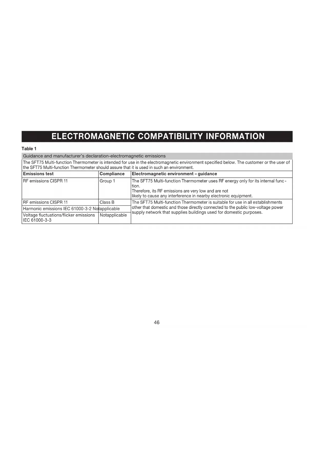 Table 1 Guidance and manufacturer’s declaration-electromagnetic emissions The SFT75 Multi-function Thermometer is intended for use in the electromagnetic environment specified below. The customer or the user of the SFT75 Multi-function Thermometer should assure that it is used in such an environment. Emissions test Compliance Electromagnetic environment – guidance RF emissions CISPR 11 Group 1 The SFT75 Multi-function Thermometer uses RF energy only for its internal func