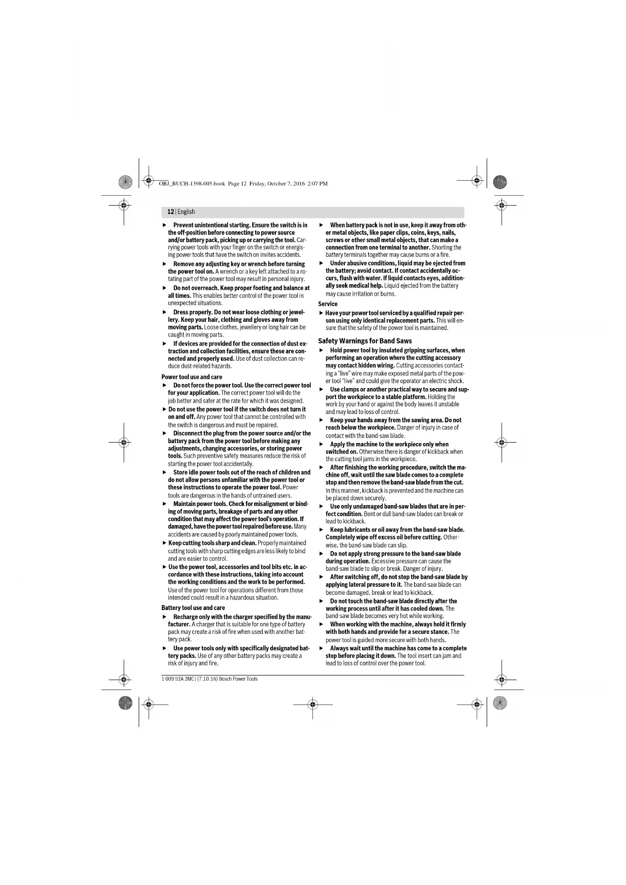 The vibration emission level given in this information sheet has been measured in accordance with a standardised test given in EN 60745 and may be used to compare one tool with another. It may be used for a preliminary assessment of expo- sure. The declared vibration emission level represents the main ap- plications of the tool. However if the tool is used for different applications, with different accessories or poorly maintained, the vibration emission may differ. This may significantly in- crease the exposure level over the total working period. An estimation of the level of exposure to vibration should also take into account the times when the tool is switched off or when it is running but not actually doing the job. This may sig- nificantly reduce the exposure level over the total working pe- riod. Identify additional safety measures to protect the operator from the effects of vibration such as: maintain the tool and the accessories, keep hands warm, organise work patterns. Declaration of Conformity We declare under our sole responsibility that the product de- scribed under “Technical Data” is in conformity with the fol- lowing standards or standardisation documents: EN 60745, EN 50581 according to the provisions of the directives 2009/125/EC (Regulation 1194/2012), 2011/65/EU, 2014/30/EU, 2006/42/EC. Technical file (2006/42/EC) at: Robert Bosch Power Tools GmbH, PT/ECS, 70538 Stuttgart, GERMANY Band Saw GCB 18 V-LI Article number 3 601 BA0 3.. Rated voltage V= 18 No-load speed m/min 162 Saw blade dimensions mm 733 x 12.7 x 0.5 Cutting depth, max. mm 63.5 Weight according to EPTA- Procedure 01:2014 kg 3.4 – 3.9*