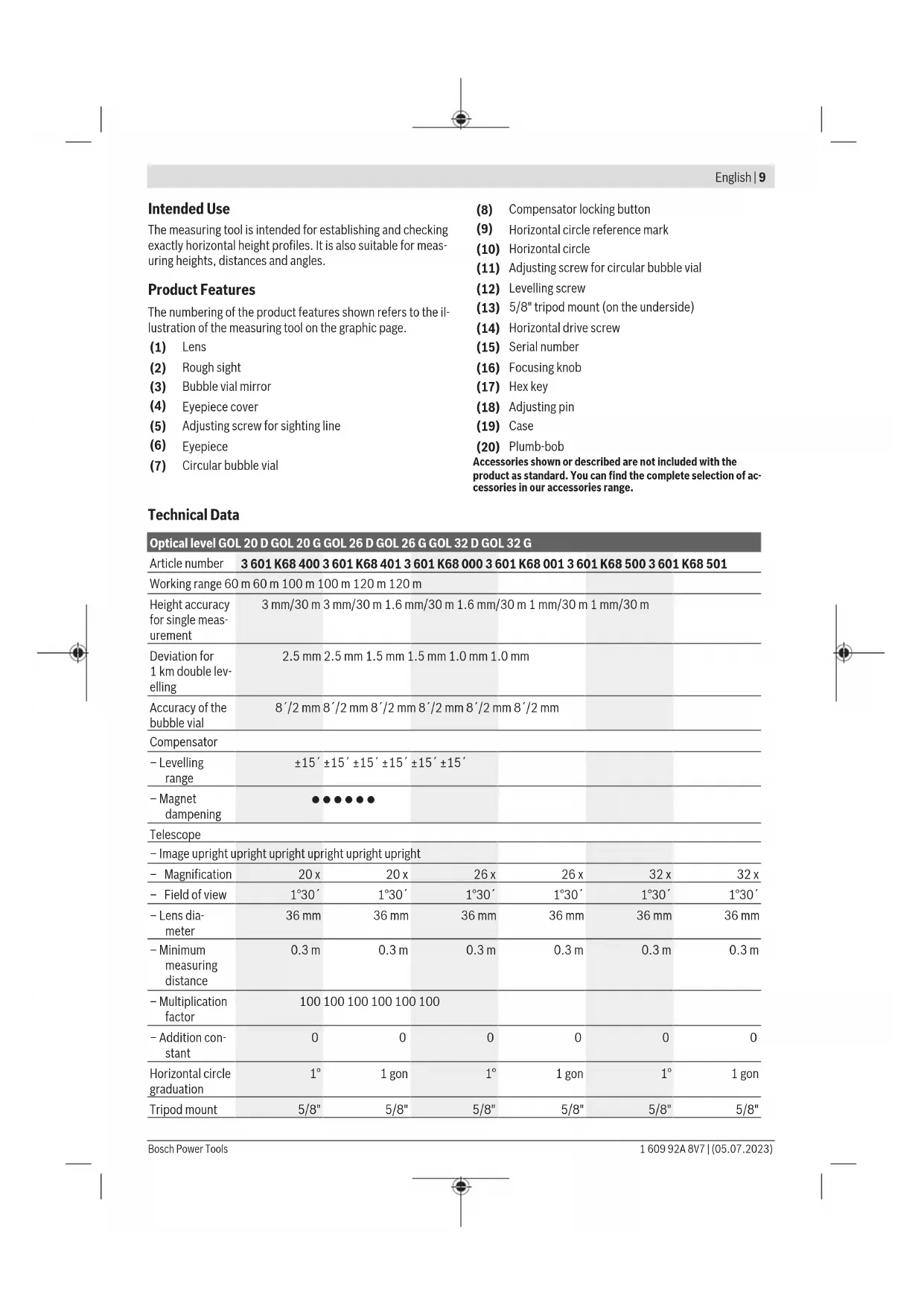 Horizontal circle graduation 1° 1gon 1° 1gon 1° 1gon Tripod mount 5/8" 5/8" 5/8" 5/8" 5/8" 5/8" Bosch Power Tools 1 609 92A 8V7 | (05.07.2023)10 | English Optical level GOL 20 D GOL 20 G GOL 26 D GOL 26 G GOL 32 D GOL 32 G Weight accord- ing to EPTA-Pro- ced- ure01:2014 1.5kg 1.5kg 1.5kg 1.5kg 1.5kg 1.5kg Protection rat- ing IP54 (dust and splash-proof) The serial number (15) on the type plate is used to clearly identify your measuring tool. Operation u Check the levelling and display accuracy of the meas- uring tool each time before beginning work and after longer transport of the measuring tool. u Protect the measuring tool from moisture and direct sunlight. u Do not expose the measuring tool to any extreme tem- peratures or variations in temperature. For example, do not leave it in a car for extended periods of time. In case of large variations in temperature, allow the measur- ing tool to adjust to the ambient temperature before put- ting it into operation. The precision of the measuring tool may be compromised if exposed to extreme temperat- ures or variations in temperature. u Avoid any impact to or dropping of the measuring tool. Always carry out an accuracy check before continuing work if the measuring tool has been subjected to severe external influences (see "Accuracy Check of the Measur- ing Tool", page11). u Place the measuring tool in the provided case when transporting it over longer distances (e.g. in the car). Ensure that the measuring tool is correctly placed in the case. When placing in the case, the compensator is locked, as the measuring tool may otherwise be damaged by strong movements. Setting Up/Aligning the Measuring Tool Mounting on the Tripod Set up the tripod so that it is stable and secured against tip- ping over or slipping. Place the measuring tool onto the thread of the tripod via the tripod mount(13) and secure the measuring tool with the locking screw of the tripod. Align the tripod roughly. Over short distances, the measuring tool can be carried whilst mounted on the tripod. In order to avoid damage to the measuring tool, the tripod must be held vertically during transport and should not e.g. be carried lengthwise over the shoulder. Aligning the Measuring Tool Align the measuring tool using the levelling screws(12) so that the air bubble is positioned in the centre of the circular bubble vial(7).