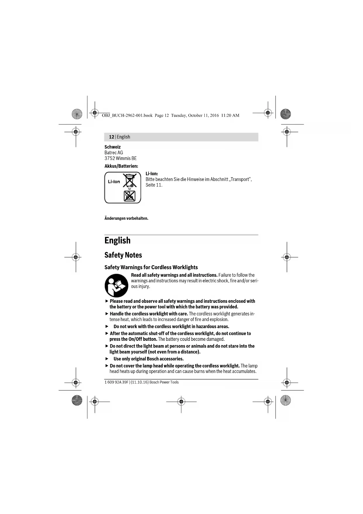 OBJ_BUCH-2962-001.book Page 2 Tuesday, October 11, 2016 11:20 AM| 3 Bosch Power Tools 1 609 92A 39F | (11.10.16) GLI 12V-300 OBJ_BUCH-2962-001.book Page 3 Tuesday, October 11, 2016 11:20 AM1 609 92A 39F | (11.10.16) Bosch Power Tools 4 |